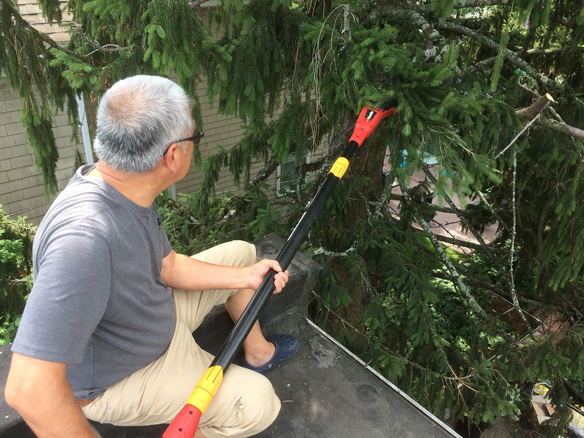at my sister's place my father and i pruned some grapevines before climbing to the roof of the house (using two ladders) to reach the neighbor's tall fir tree. it had branches that were overhanging the house, making it easier for squirrels to get to the roof. we used an electric pole saw to get at the branches. i finished by 12:20pm, leaving with a container of curry rice noodles. instead of going home, i went to belmont to check for new skunk holes and to try out my new baby nasal aspirator AKA diatomaceous earth sprayer.