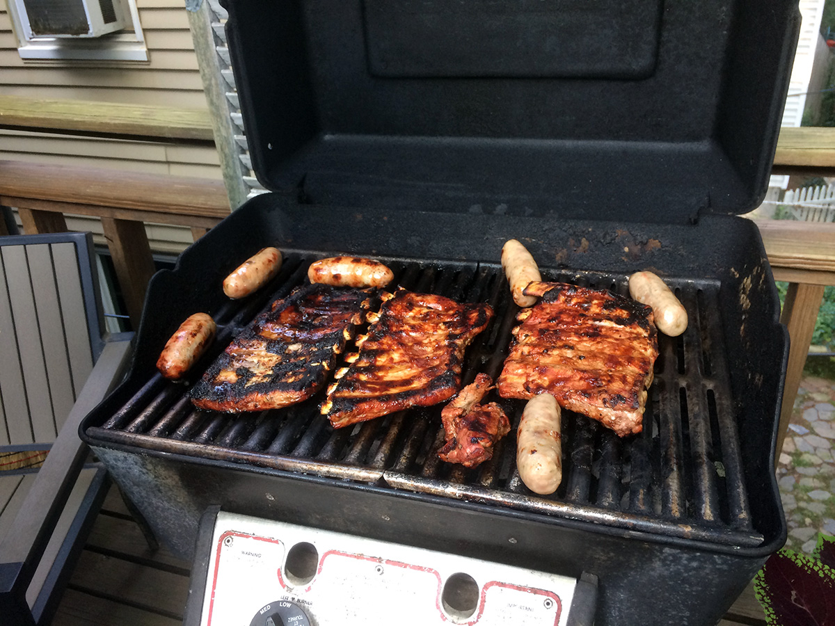 at 5:30pm i told annie's mother i was going upstairs because i'd been invited to dinner. i found leon outside on the upstairs deck preparing the grill. he was looking at something in the neighbor's yard. "is that a turkey?" he asked in disbelief. his younger son ethan (5) was home, his wife and older son bryan (8) yet to come back. ethan was more playful and outgoing, but maybe too playful, as he casually grabbed my ass and asked alexa to play "baby shark". he also kept asking me to guess where his different relatives lived, the correct answer was always "beijing". leon had two slabs of ribs coated with sweet baby ray barbecue sauce and a large piece of steak. to that i added my half dozen italian sausages. he offered me a yuengling beer, although i would've much rather preferred the IBC root beer i brought, which ethan ended up sampling.