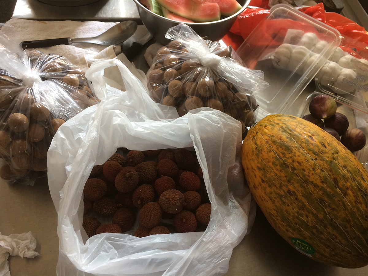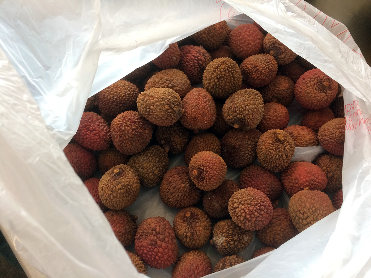 some vendors were still selling lychees, and i recognized the ones that had the tiny seeds (bumpier skin). i bought some from a seller offering them for $2/lbs. but she seemed new and was reading the sign upside down so got confused, and gave me 2lbs./$1 so i received 5 lbs. worth of prime lychees for just $5.