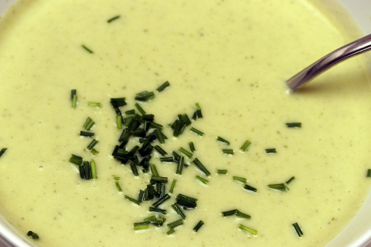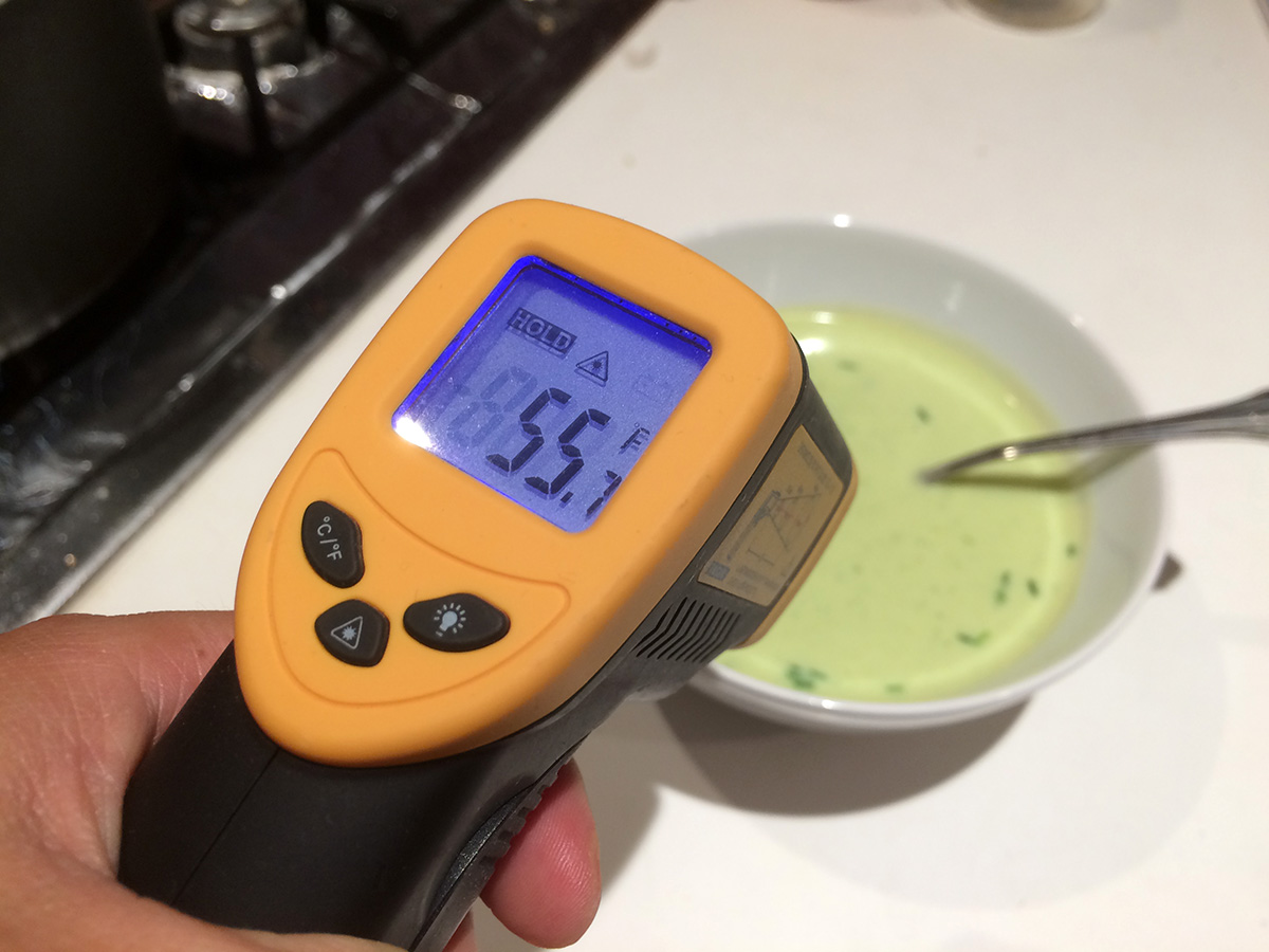 when evening rolled around i got a chance to try the vichyssoise. i went out to bruce's place and snipped a few strands of chives. he told me the optimal serving temperature was slightly below room temperature, so i took a measurement with my infrared thermometer to make sure i was following the rules. the soup had a pale yellowish green color.