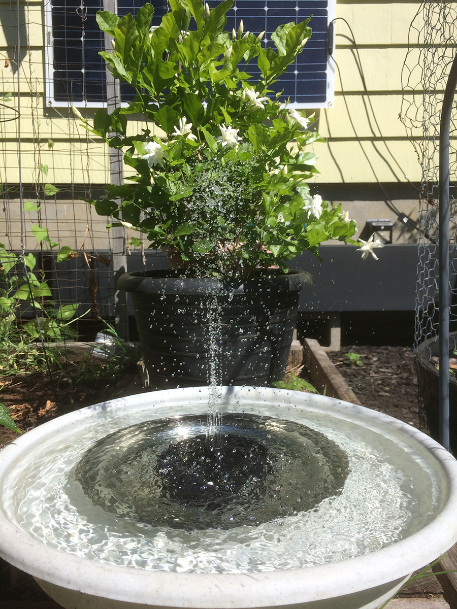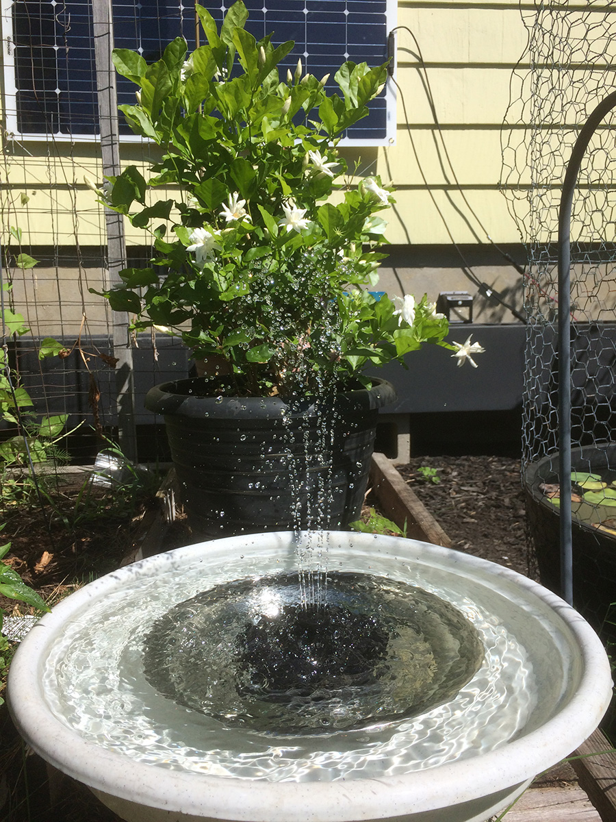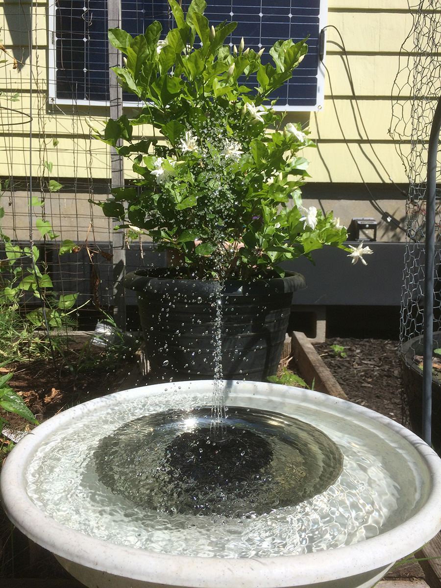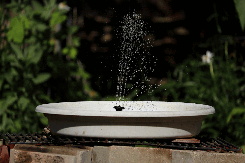 it was a sunnier day compared to yesterday, and the solar water fountain was working at maximum capacity. my father found a large plastic dish (the bottom tray of a large pot) so the water won't spray out. i took the opportunity to try the different nozzle heads. there's one that's just a nub, which puts out just a constant dribble of water, almost the same effect if you didn't have any nozzle attached at all. the one i'd been using has 6 "orbital" holes and one center raised hole. that one gives a clean controlled spray. the nozzle with 13 holes has the most sprays, but the resulting spray is kind of a mess,