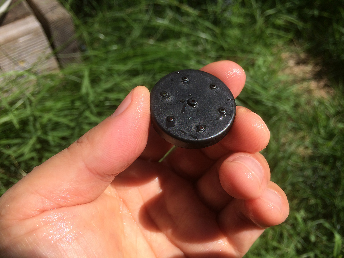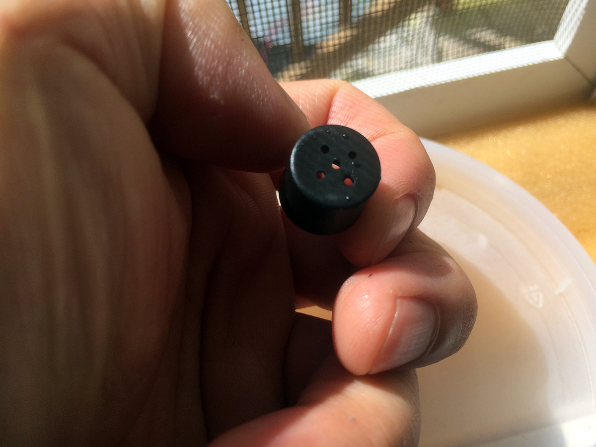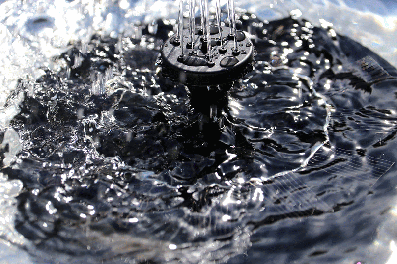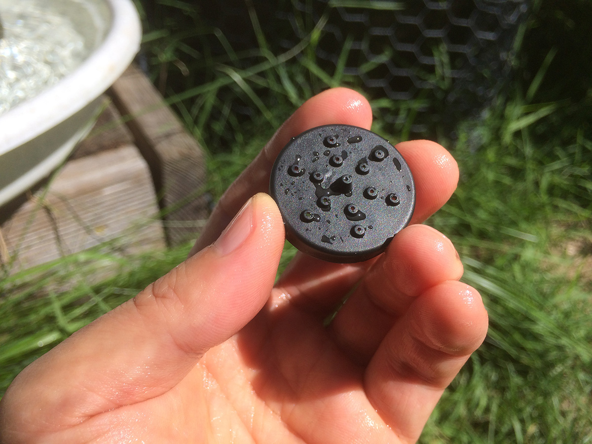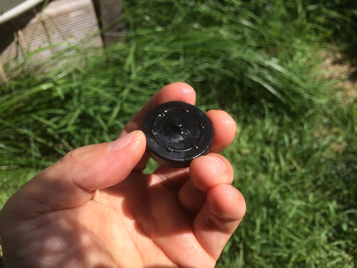 it was a sunnier day compared to yesterday, and the solar water fountain was working at maximum capacity. my father found a large plastic dish (the bottom tray of a large pot) so the water won't spray out. i took the opportunity to try the different nozzle heads. there's one that's just a nub, which puts out just a constant dribble of water, almost the same effect if you didn't have any nozzle attached at all. the one i'd been using has 6 "orbital" holes and one center raised hole. that one gives a clean controlled spray. the nozzle with 13 holes has the most sprays, but the resulting spray is kind of a mess,