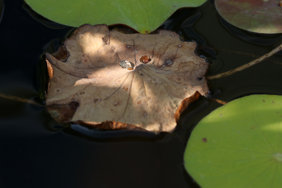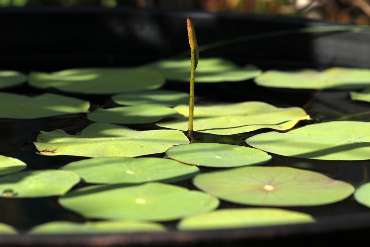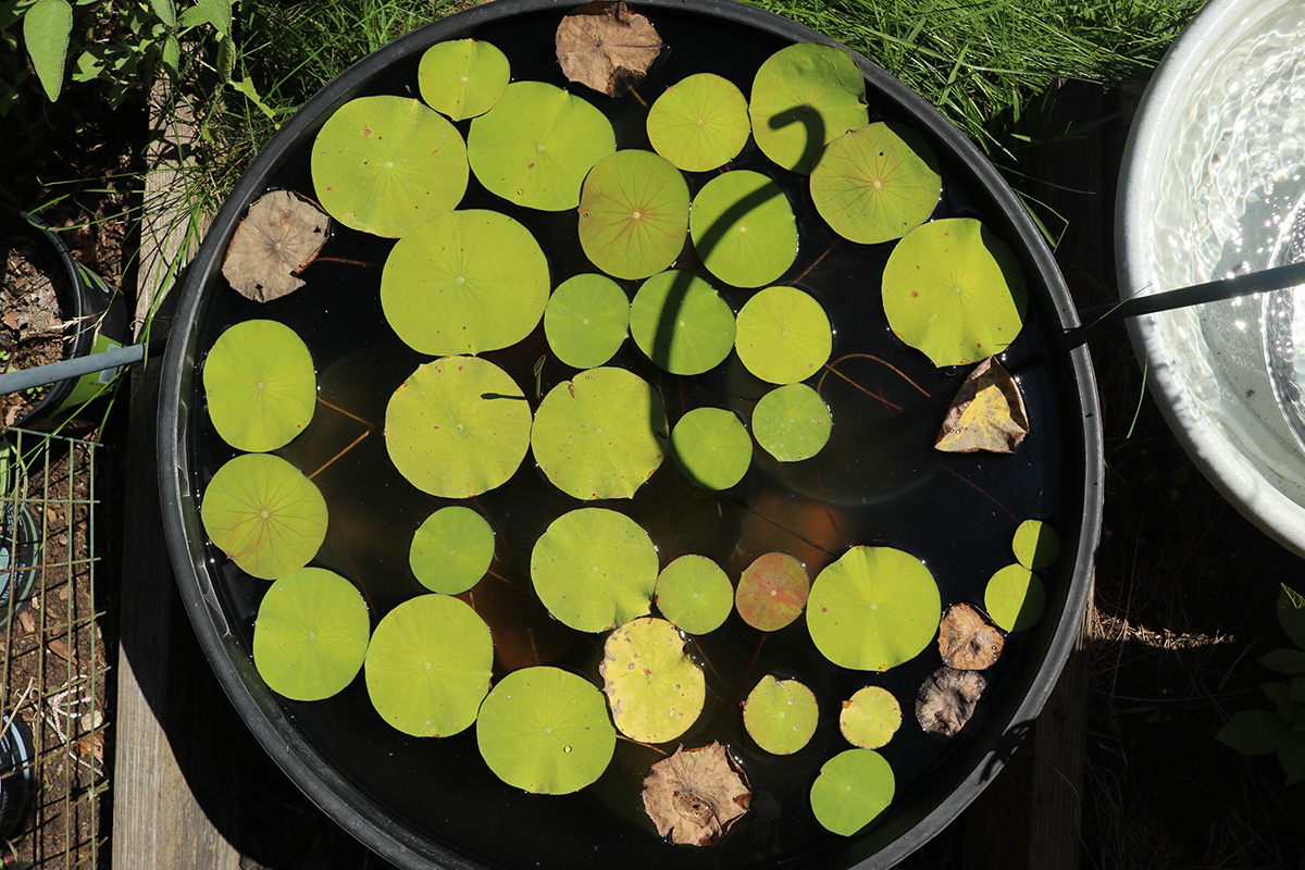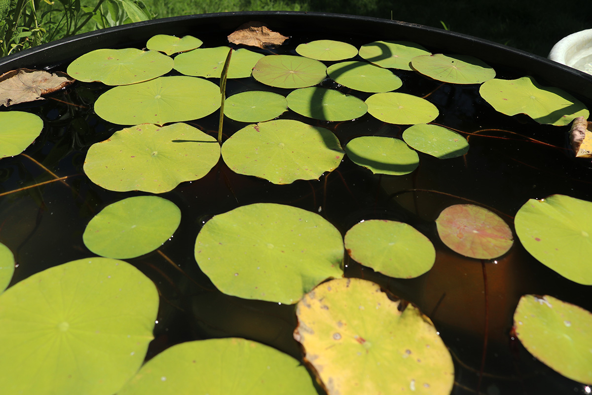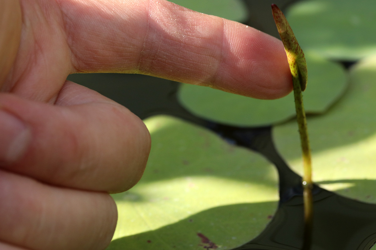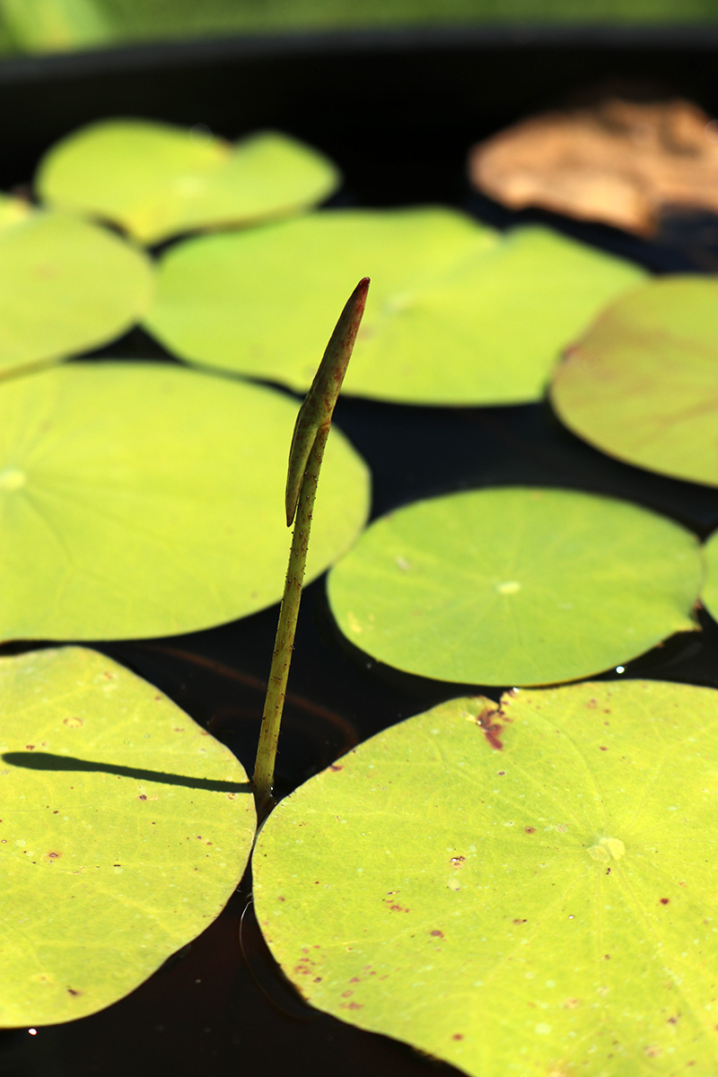 while playing around with the solar fountain i glanced at my lotus plants and was surprised to find a single leaf stalk poking far out of the water: an aerial leaf! finally, with august midway through, we have our first aerial leaf. hypothetically anyway, since the leaf was still closed. it could very well flop back into the water. i could really care less if we get aerial leaves or not, but aerial leaf production indicates that the lotus needs fertilizing. however, all the online info i read said to wait until 2 or more aerial leaves before fertilizing.