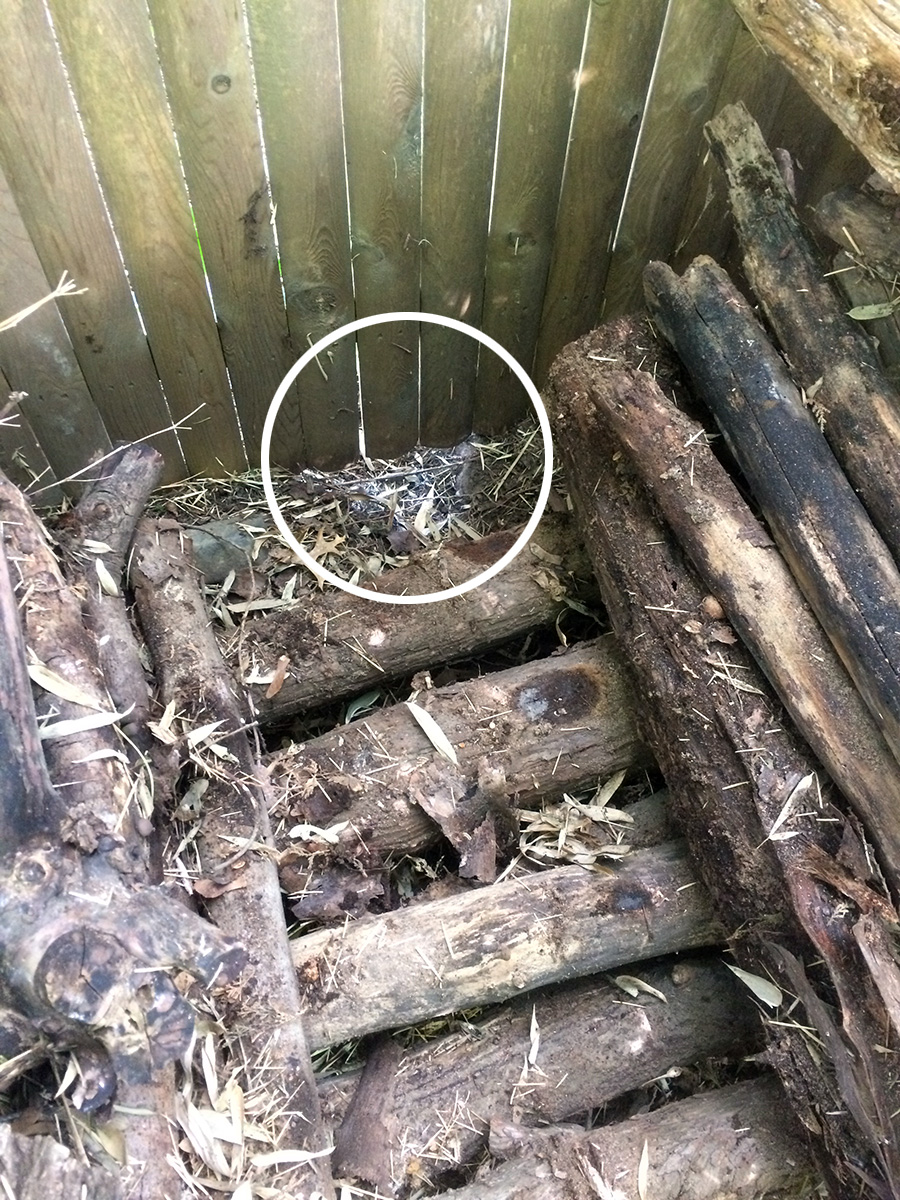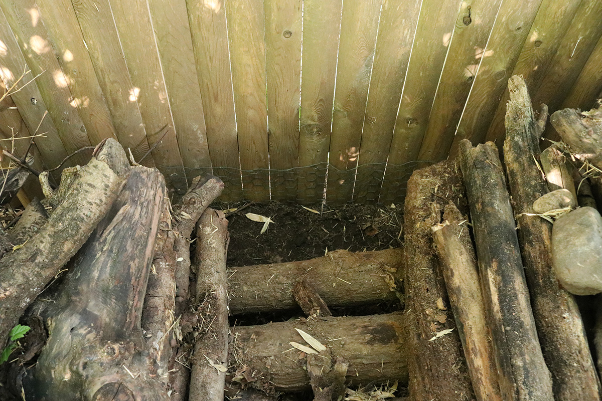 first thing i did when we got back was to patch up that rabbit hole behind the log pile. i first had to clear away enough logs to reach the hole. along the way i found some large leopard slugs which i quickly dispatched, i'm no friends of slugs. it was in an awkward spot that i couldn't install a 4x1 ft. length of wire fencing, so instead i used a length of chicken wire and stapled it to the fence, burying 3in. worth of chickenwire at most. i'm hoping it's mostly rabbits who come into the yard from the eastern fence, and rabbits aren't as strong a digger as woodchucks, so a little bit of chickenwire will hopefully keep them out.