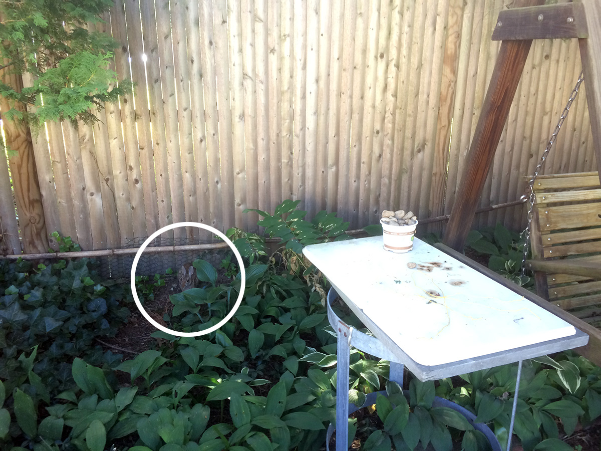 first thing i did when i arrived in belmont this morning was to check the perimeters. that's when i spotted the rabbit sitting in the eastern shady garden bed. my father and i tried to flush it out onto the street but it was too stupid to run through the open gate and instead ran to the southeastern corner of the yard, behind a stack of raised wood piles, and disappeared. i looked along the fence and spotted the rabbit hole. repair work would have to wait.