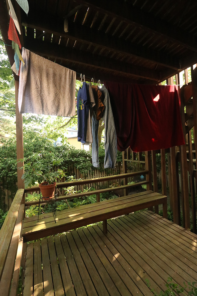 in all the years i've lived here, i never thought to put up a clothesline in my backyard. the problem is i hardly get any sun during the summer, and never thought it was even possible to dry clothes out there. but clothes can dry even without the sun, as long as it's dry outside. on a few rare occasions that i've had to dry clothes on the line (like when my dryer broke), i just draped them over the back of chairs or made makeshift clotheslines in the kitchen.