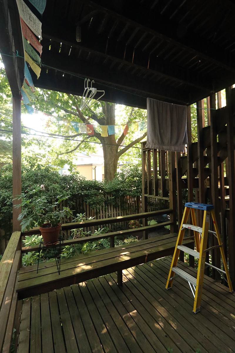 after i put up the clothesline, i did a load of laundry, including the bedsheets from the guest bedroom. unfortunately i started too late, after 3pm, and didn't hang the wash up until around 4pm. i thought i'd need a ladder or one of those clothesline poles, but i found out i can just as easily reach the rope while standing on the built-in deck bench. once night came around, i didn't want to leave the clothes outside because it would remain wet from the dew. luckily the sheets were dry by the most part, just some clothes, so i ended up draping them on the back of chairs to air dry indoors.