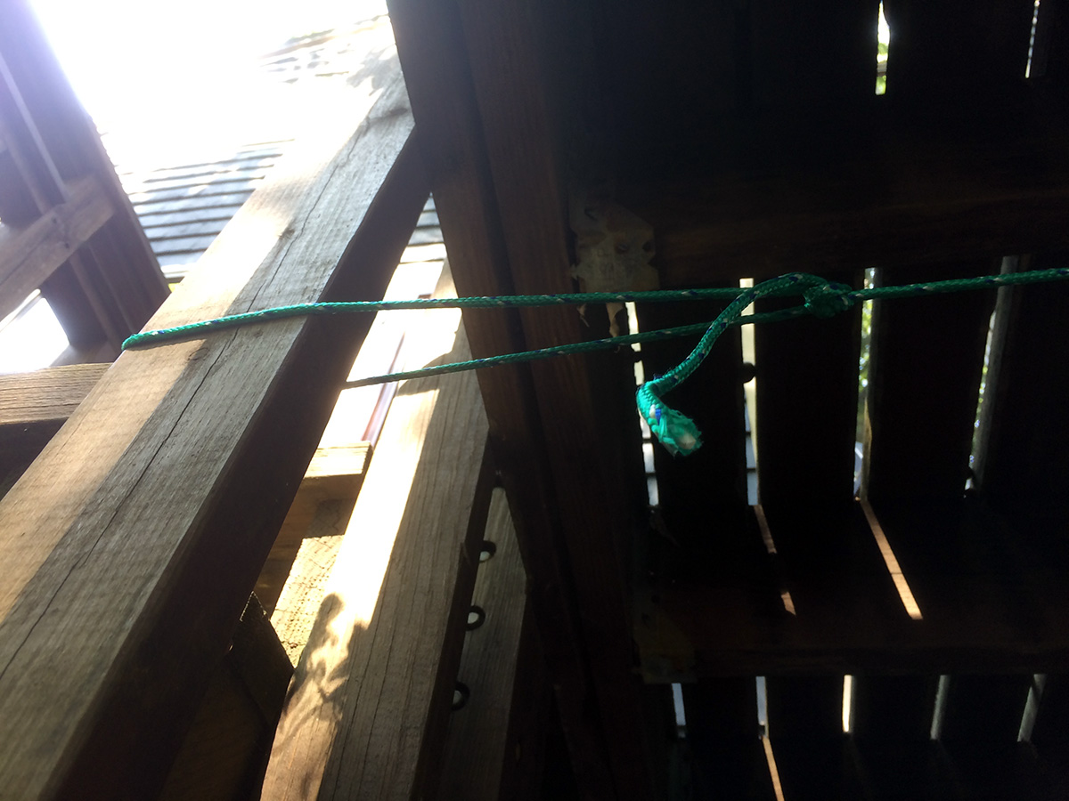 just so happens i had a coil of clothesline rope i bought from the dollar store a few days ago. so i went online and researched proper clothesline knots. i ended up tying a bowline knot on one end, and a midshipman's hitch on the other end. the advantage of the hitch is that it's adjustable, but still won't slip. i practiced a few times last night, looking at different diagrams to make sure i'd done it correctly.