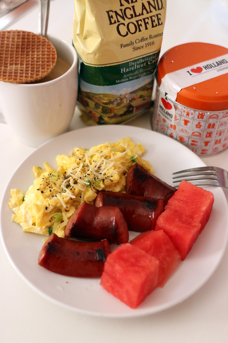after they left i started making lunch: scrambled eggs (2 eggs, half & half, chopped scallions), kielbasa sausages (heated until crispy in the toaster oven), some watermelon cubes i already had on hand, and a mug of decaffeinated hazelnut cream coffee. i thought the stroopwafels were just going to be waffle cookies, i wasn't expecting they'd have a soft filling on the inside. for my money, i think i still prefer the italian pizzelles (remind me to get some the next time i'm at the supermarket).