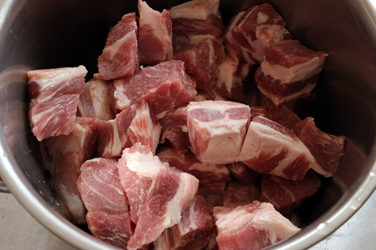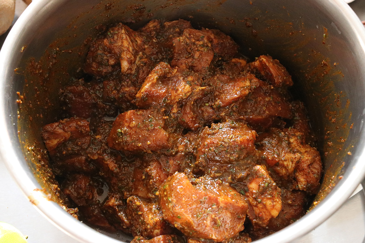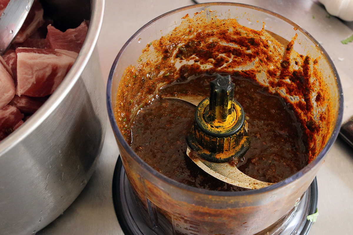 | cut pork into cubes and sprinkle with salt. add remaining ingredients into food processor and blend to make marinade. mix marinade with pork and leave overnight. | |