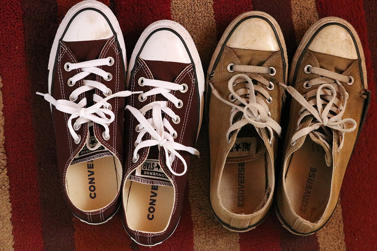 i finally tossed out my old pair of converse sneakers. they were falling apart to the point where my pinky toes were poking out of the sides. fortunately i already have a replacement pair on standby.