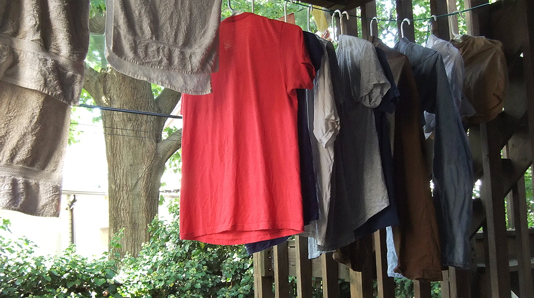 my job today was to collect the necessary food ingredients: trader joe's for some cheap wine to make sangria, market basket for some sausages, and haymarket to gather some inexpensive fruits and vegetables. but the first thing i did this morning was to do a load of laundry so they could have the entire day to hang dry outside. i only hang my shirts and pants; underwears and socks i dry indoors, drape across chair backs. i like the novelty of hang drying my clothes, i also like that it's totally free, like solar power. this is just the second time i've hung up my clothes, after successfully drying them the first time a few weeks ago. i can do this while the weather stays warm (and while i don't have a roommate); once we get into late fall and temperature drops close to freezing, i'll go back to my dryer.
