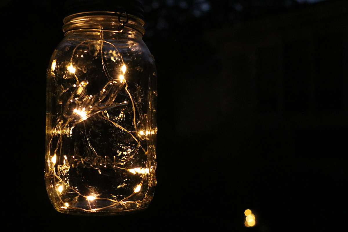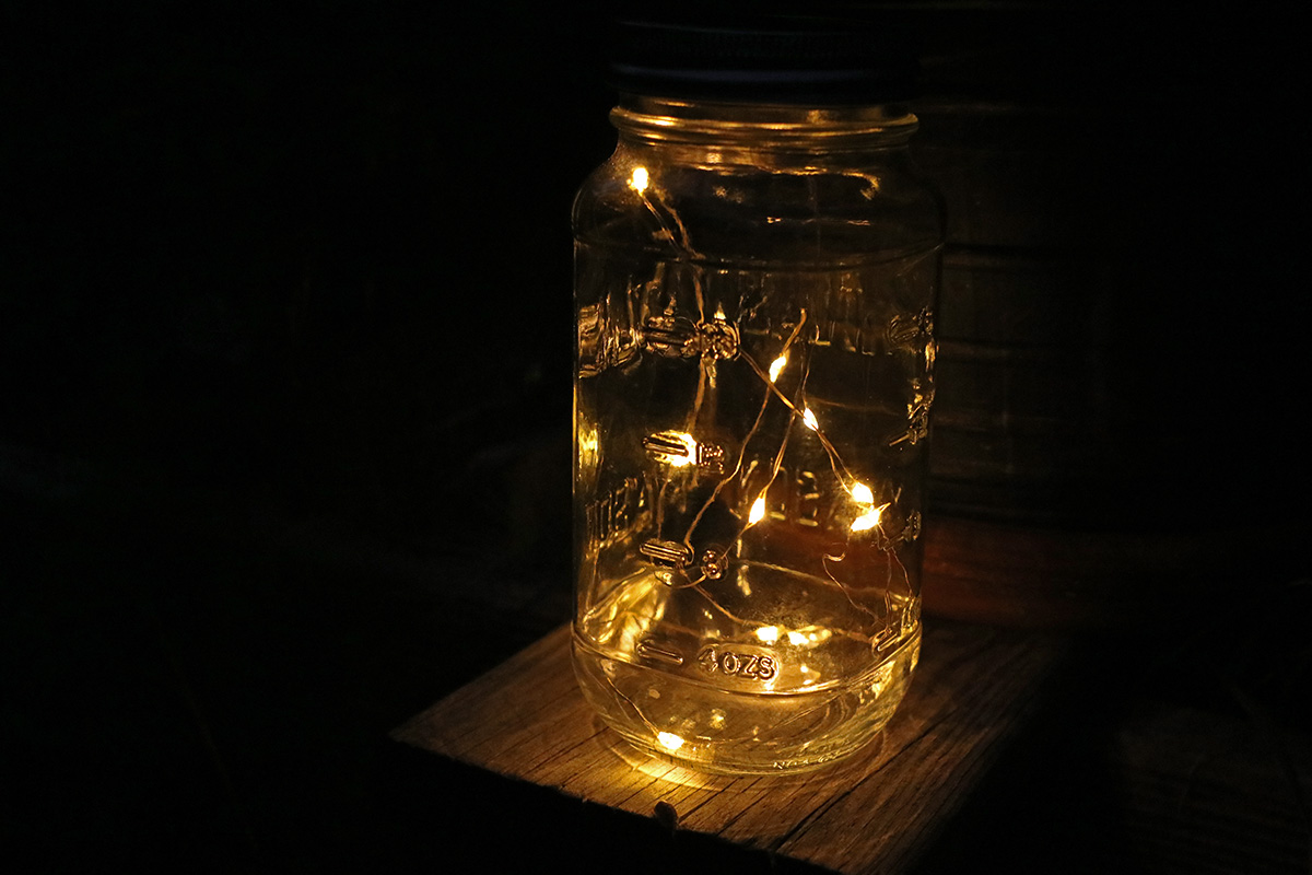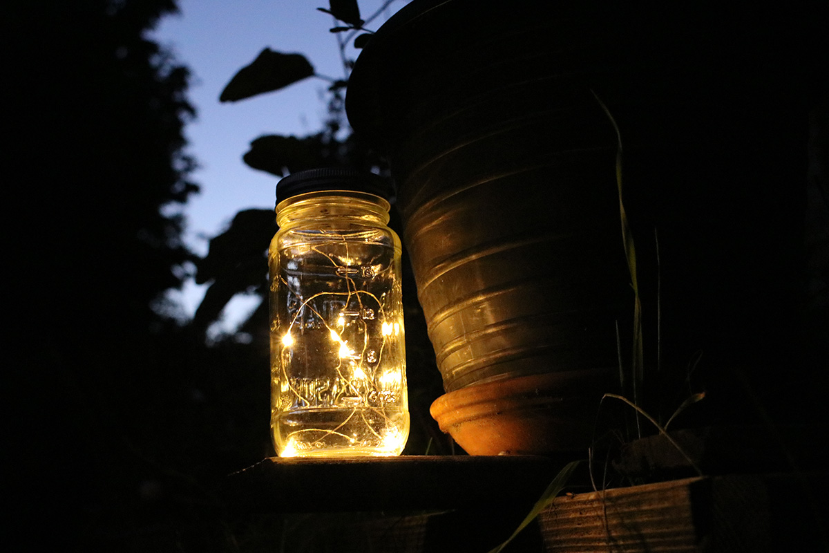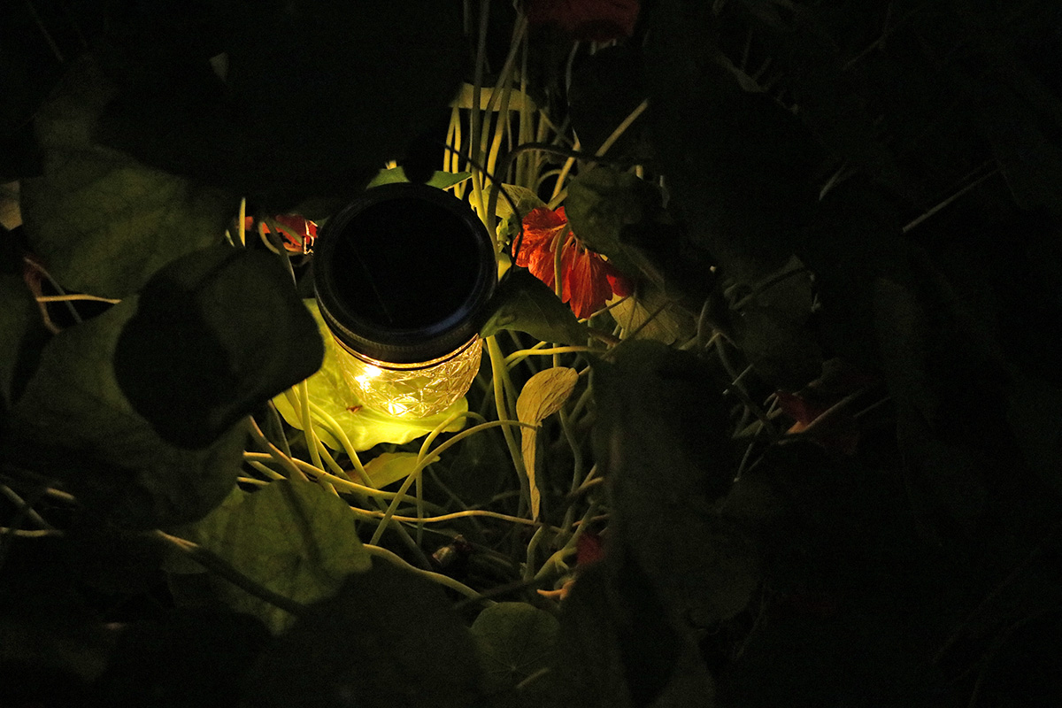i got a chance to assemble some mason jar solar fairy lights and set them outside to charge up the batteries for the evening light show. i think rounded top pint jars look the best; jelly jars seem too small, and recycled pasta sauce jars (which are compatible with mason jar lids) seem too big.