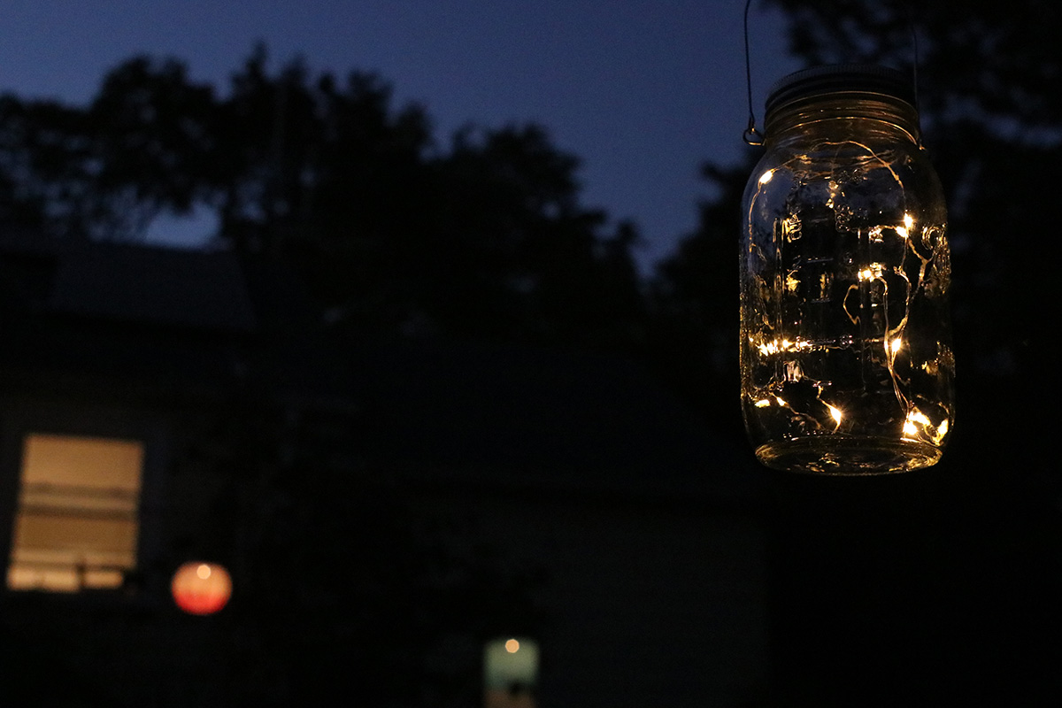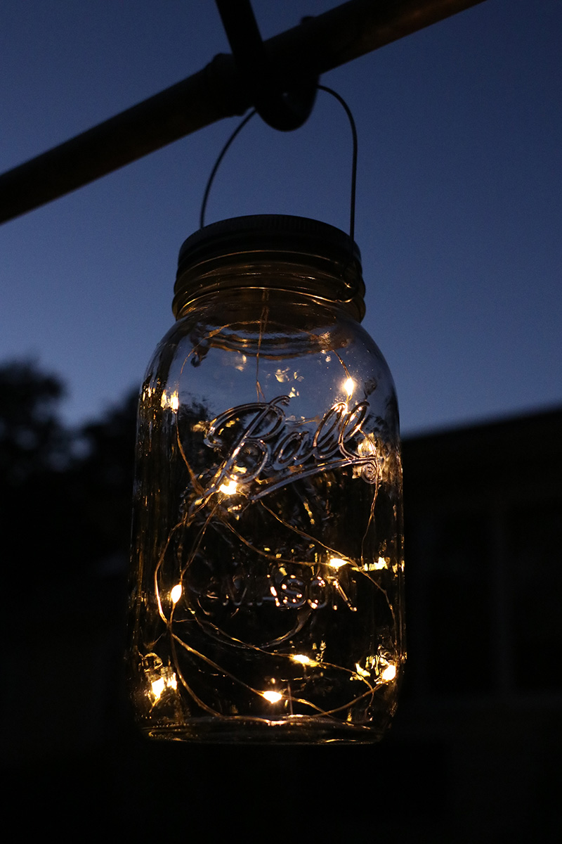 after dinner, i waited for it to get dark enough for the solar lights to turn on. there was a time not so long ago (2010) where i had solar garden light fever and bought several boxes for the backyard. they last a few seasons, but the weather eventually took its toll on them, as the batteries wore out and the panels became cloudy. some of them can probably be revived as they lay in a box in the garage, but my new obsession are mason jar solar string lights. i just happened to have found a box of discarded mason jars a few weeks ago.