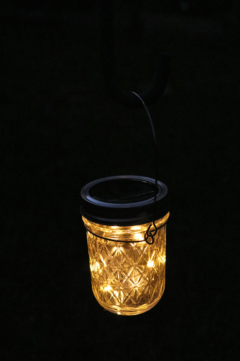 the mason jar solar string lights definitely looked cool. one or two of them didn't light up because the battery didn't have enough time to charge up completely today. they'd even be cooler if they could somehow blink softly on and off like fireflies. it'd also be cool if they came in different colors, though it'd be an easy modification to make, splice some alternate colored string lights to the solar charging lid. 10 LED's is definitely enough, gives just enough brightness while at the same time conserving battery life so longer lasting nightly illumination. they sell these solar mason jar lids with 20 and 30-strand LED's but i think that's just overkill unless you have a really large mason jar you want to light up.
