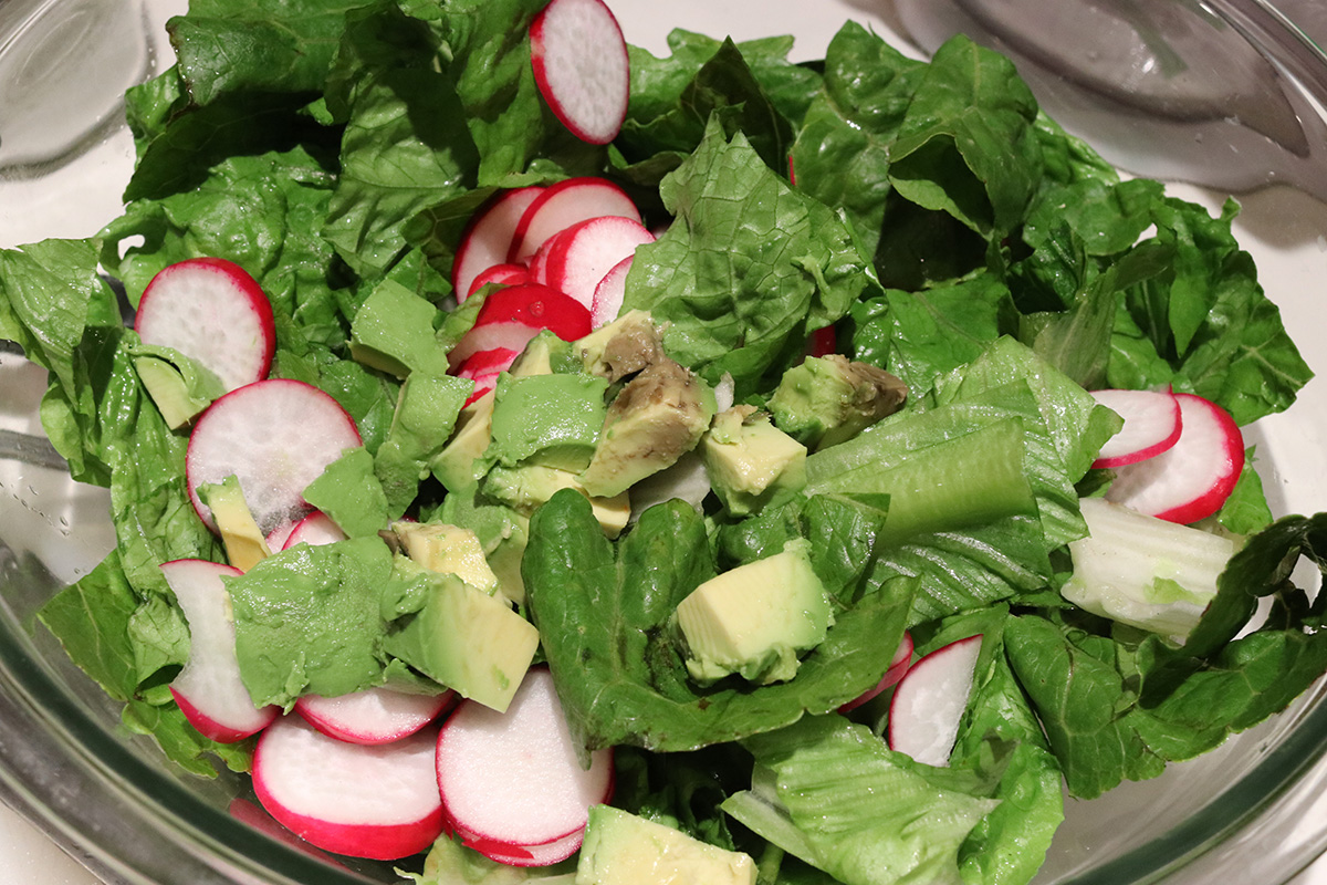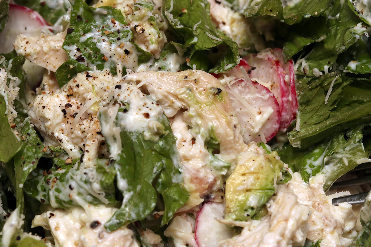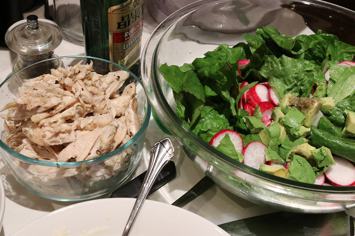 i didn't start cooking until 8pm, where i tenderized some chicken breasts, drizzled them with olive oil-salt-pepper, and baked them in the oven for 30 minutes at 350°F. they were done by 8:40pm. the breasts seemed a little tough and i couldn't shred them easily with forks so i just used my hands. i made the dressing which was a combination of greek yogurt, olive oil, lemon juice, fresh grated parmesan cheese, and roasted garlic pulp. i mixed it by hand, wonder if it'd taste better if i used the food processor to blend the ingredients. it wasn't so much a creamy dressing as just a sour yogurt sauce with sour lemon juice. the sourness was so overpowering, i could hardly taste any of the parmesan or the garlic. i chopped up some lettuce (dried it in the salad spinner), some radishes, and half an avocado.