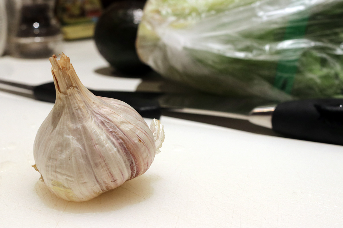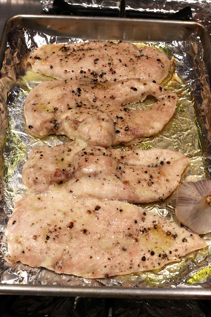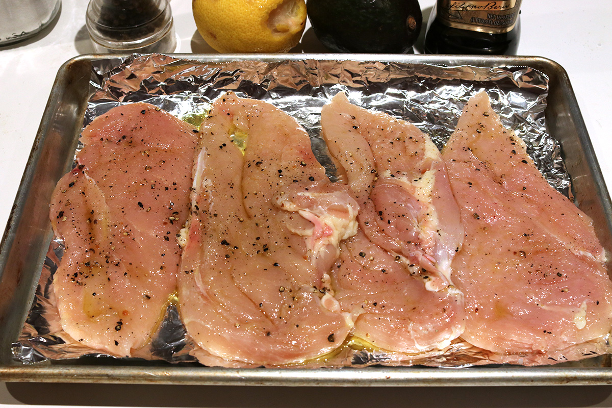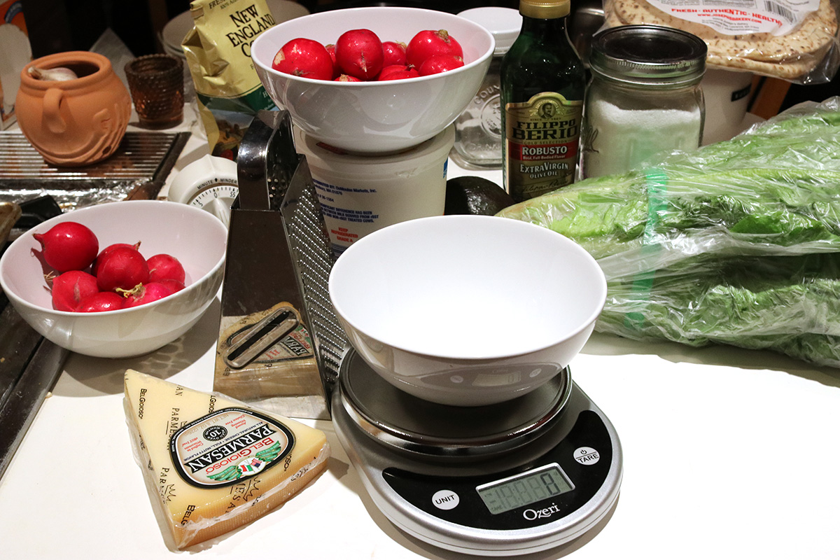 i didn't start cooking until 8pm, where i tenderized some chicken breasts, drizzled them with olive oil-salt-pepper, and baked them in the oven for 30 minutes at 350°F. they were done by 8:40pm. the breasts seemed a little tough and i couldn't shred them easily with forks so i just used my hands. i made the dressing which was a combination of greek yogurt, olive oil, lemon juice, fresh grated parmesan cheese, and roasted garlic pulp. i mixed it by hand, wonder if it'd taste better if i used the food processor to blend the ingredients. it wasn't so much a creamy dressing as just a sour yogurt sauce with sour lemon juice. the sourness was so overpowering, i could hardly taste any of the parmesan or the garlic. i chopped up some lettuce (dried it in the salad spinner), some radishes, and half an avocado.
