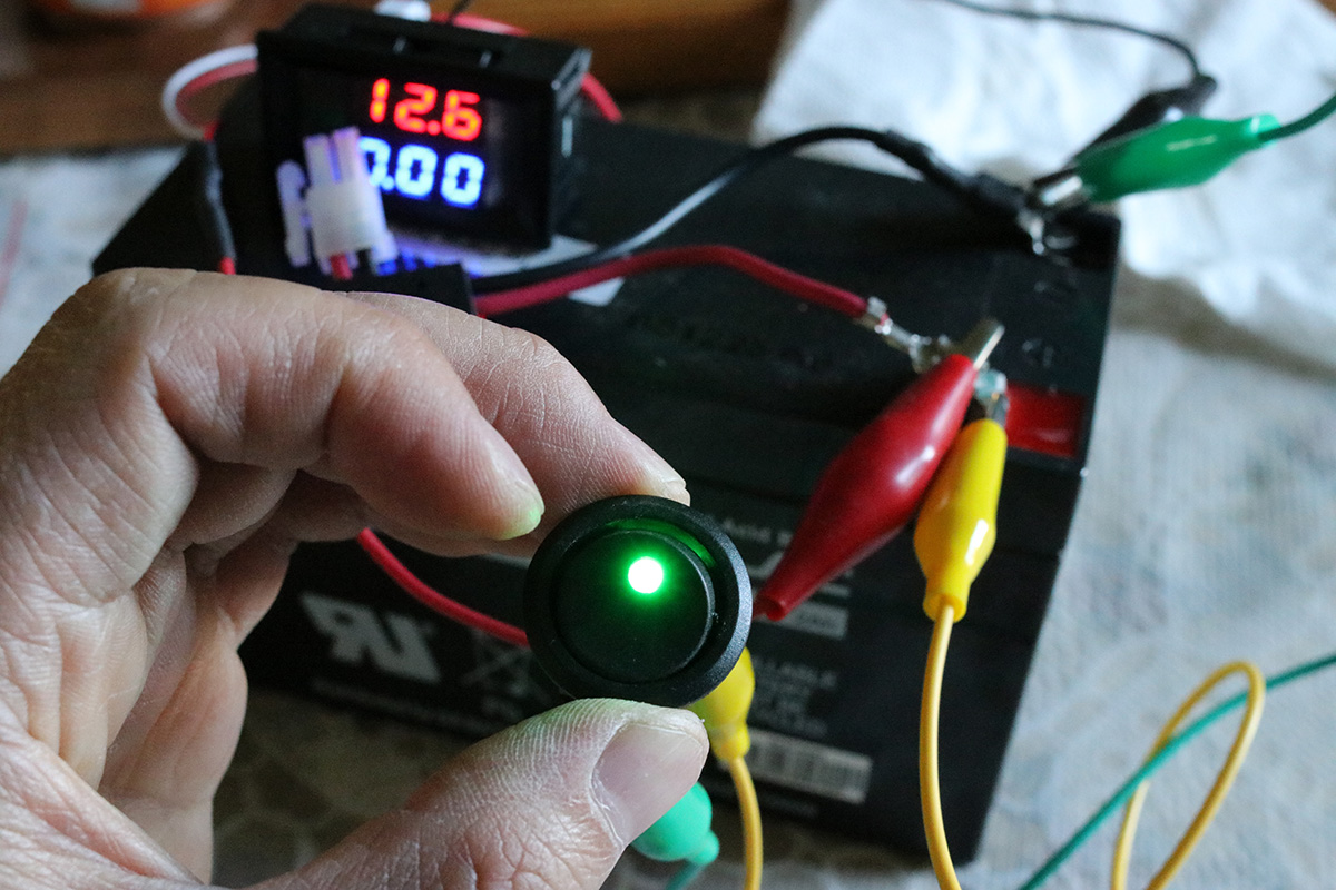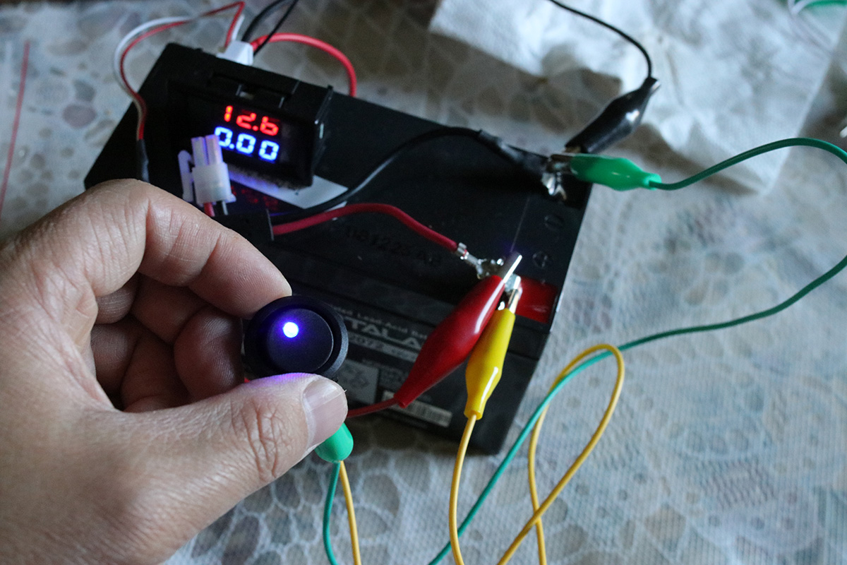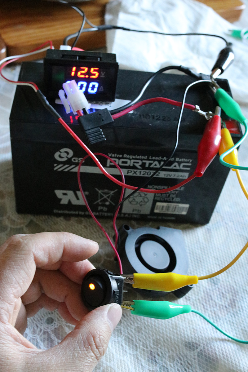 next i tried connecting the 12V toggle switches to the battery. my father tried to test a toggle switch a few days ago but he connected it wrong and saw his wire attached to the battery beginning to burn and smoke and quickly disconnected everything. i thought maybe he fried the switch but i tested them all and they all seem fine. i found a bundle of alligator clip wires, the same kinds i bought earlier today, and wondered if the ones i'd ordered already came and arrived in belmont instead of my place. regardless, i managed to connect the toggle switch and get it work, light up the led inside. i also hooked up a load - a small computer fan - and got it to work with the switch.
