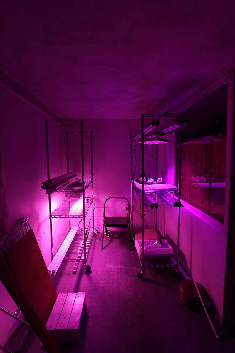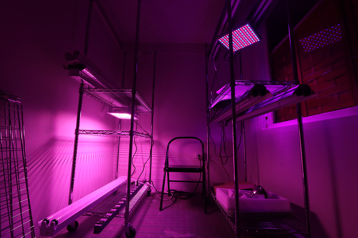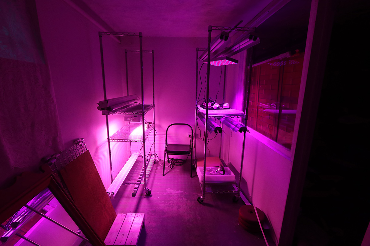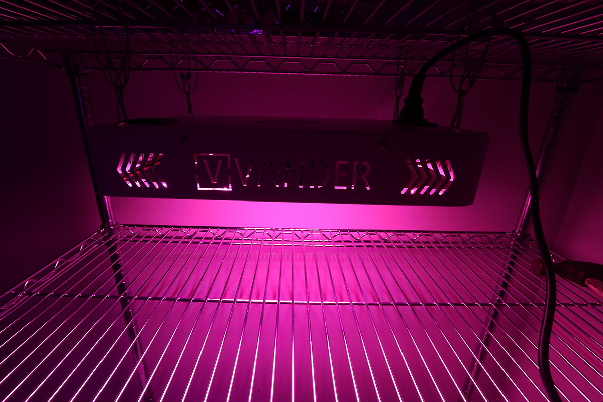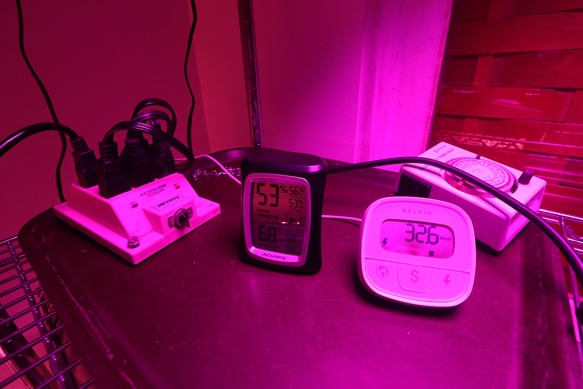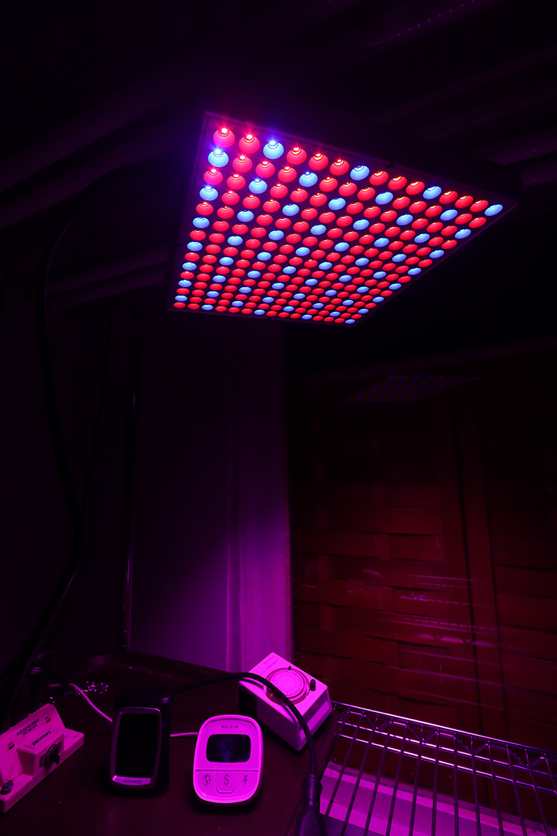 i looped the metal suspension wires of the led grow light and clipped them to mini carabiners so they could hang higher up, allowing more space for the eventual plants below. it's only a test, eventually we need to hang the grow light in such a way that it'd be easier to adjust the height. i attached the watt meter to the fluorescent light banks along with the old 45W LED grow light. the 45W light actually uses 33W of power. it runs silent, doesn't need a fan, but it uses old led technology (just 2-1/2 years old! light was only purchased in early 2017) which appear less bright compared to the new XECCON led grow light. it's also only just blue and red leds so the color it gives off is an eye-straining blurple.