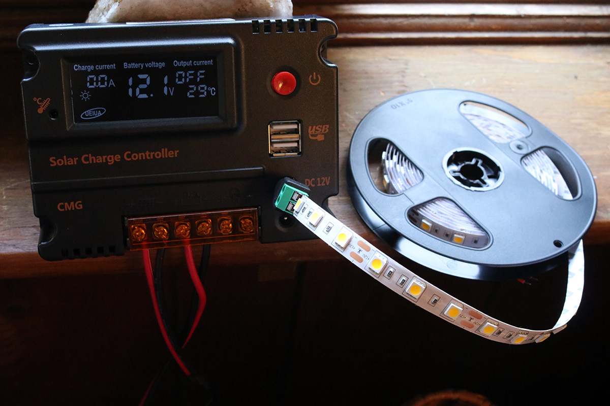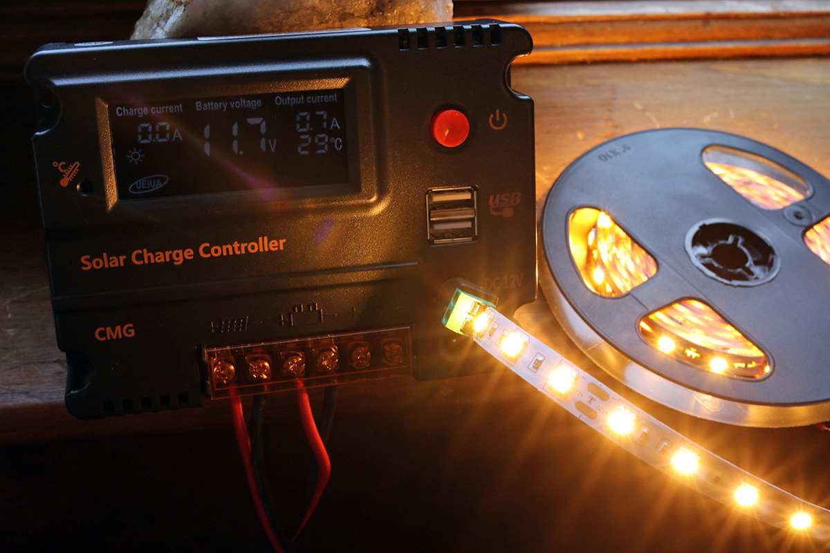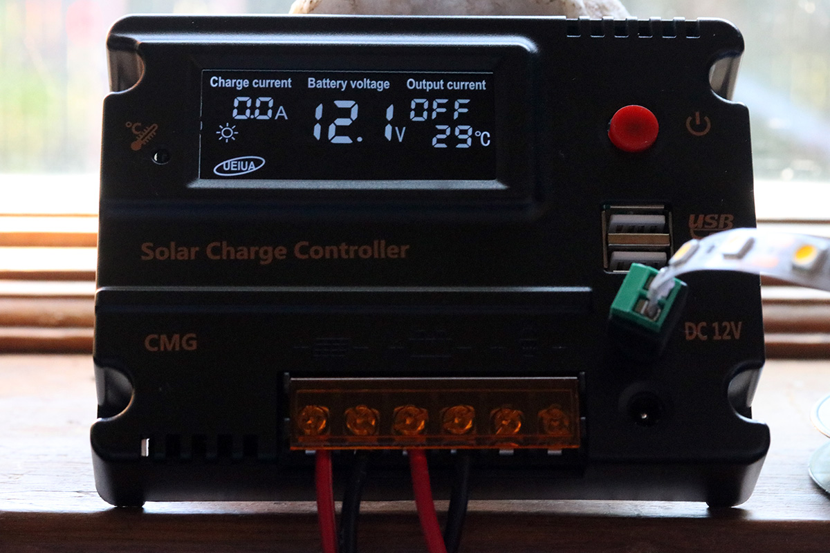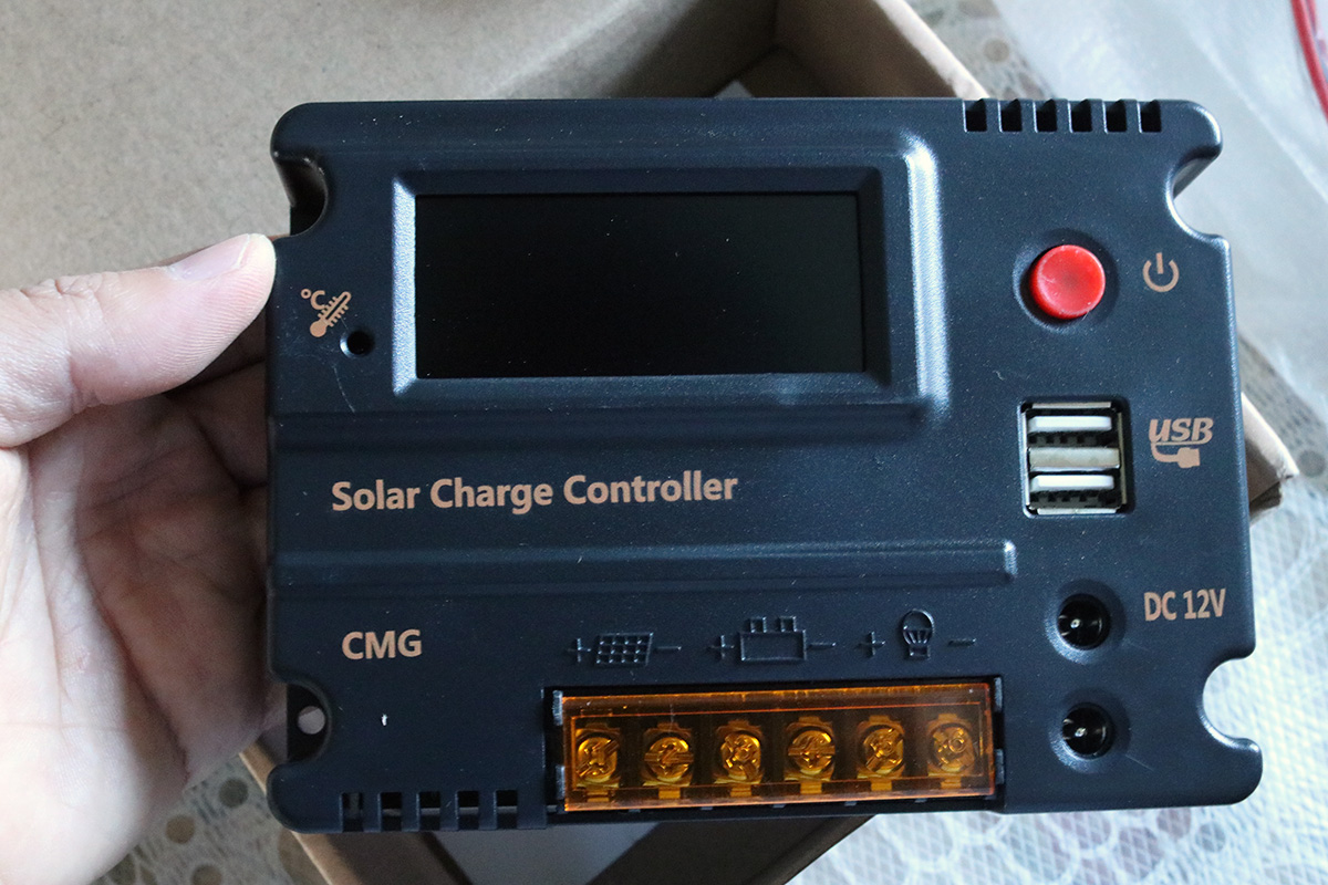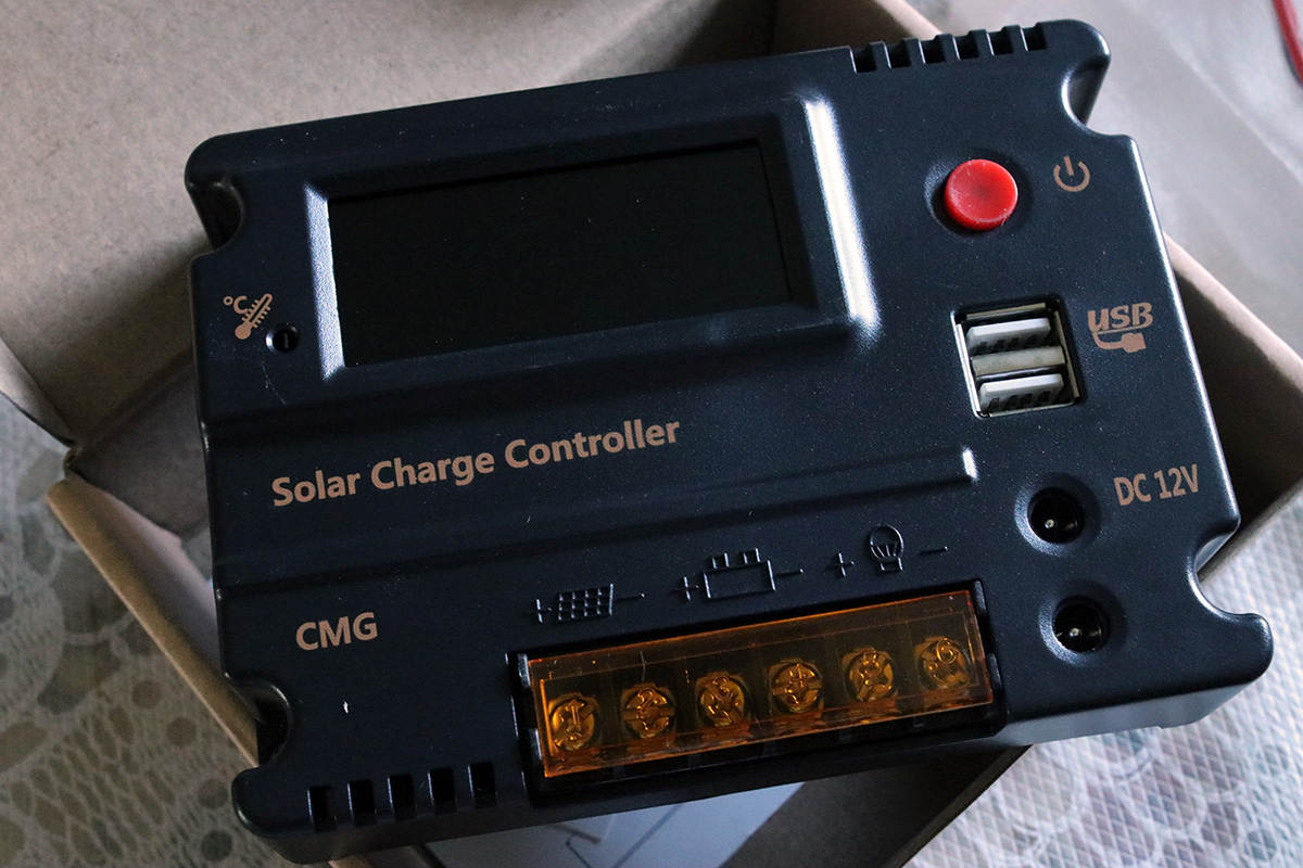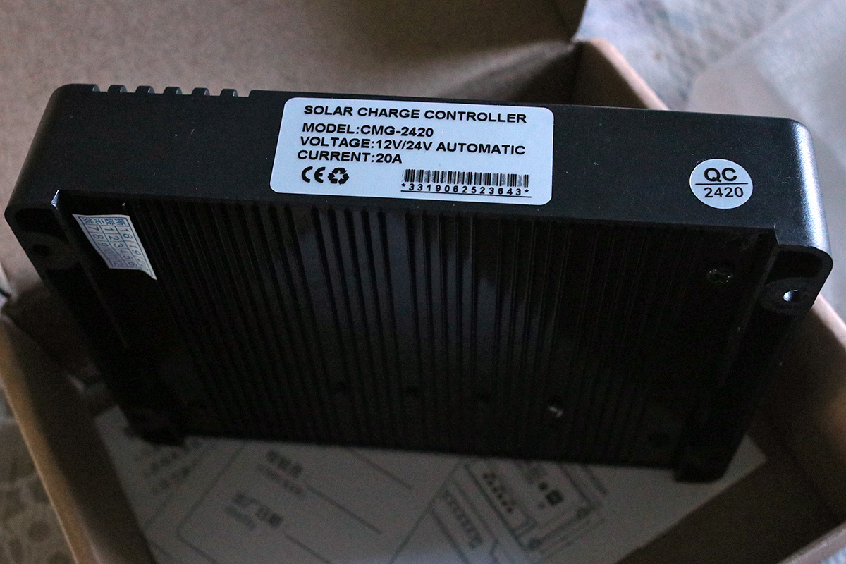 the CMG-2420 solar controller arrived in the mailbox while i was in belmont. out of the box, it was a lot bigger than i'd imagined. i didn't think i could connect it to the 1.5W solar panel and battery because it used screw-type instead of insert-type connectors, but i was able to secure the AWG10 wires into the terminal block without any problems. the LCD screen is nice, white text on a black background, a lot easier to read. i tried the 12V DC output and connected a spool of 5050 strip lights which worked perfectly.