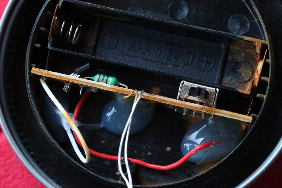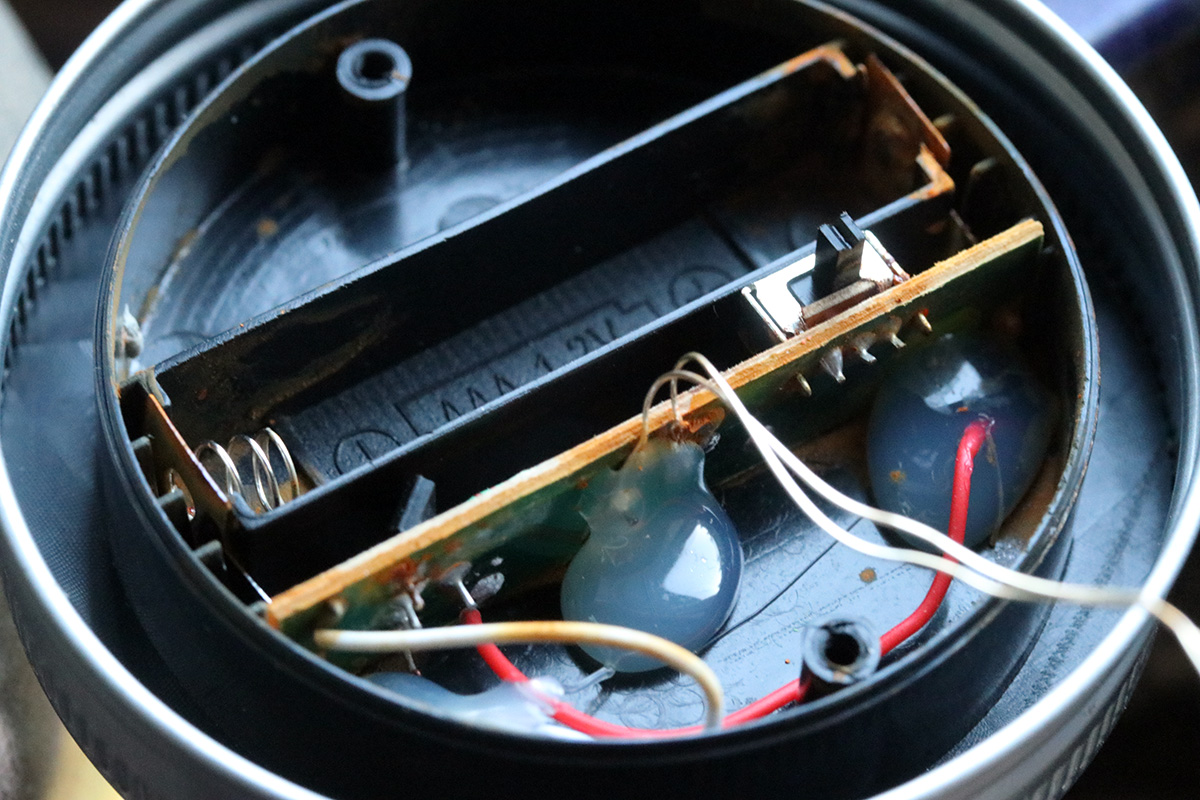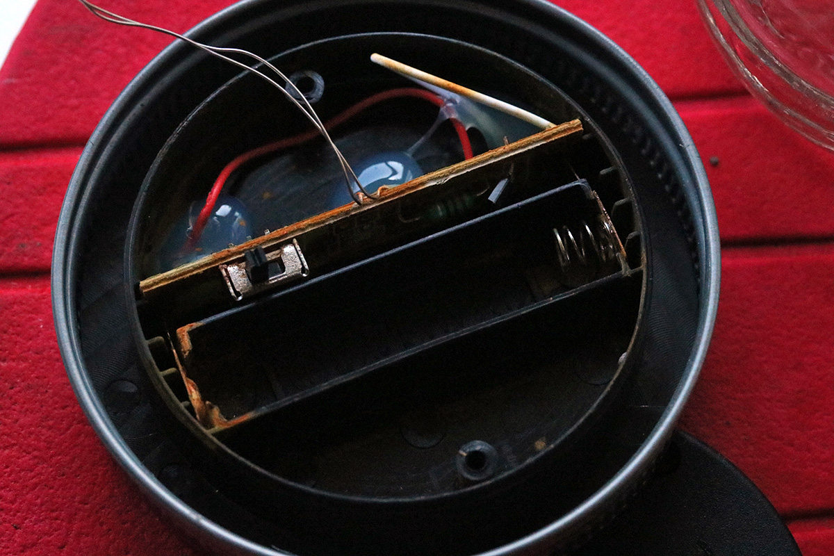 i opened up the leaking solar light mason jar lids to look around inside. the circuitry is pretty simple: solar panel charges battery, battery goes to a switch, switch toggles the strand of led string lights that has a resistor in place to filter the input voltage. there's also a solar charging IC component just like the one found in the other solar light i took apart.