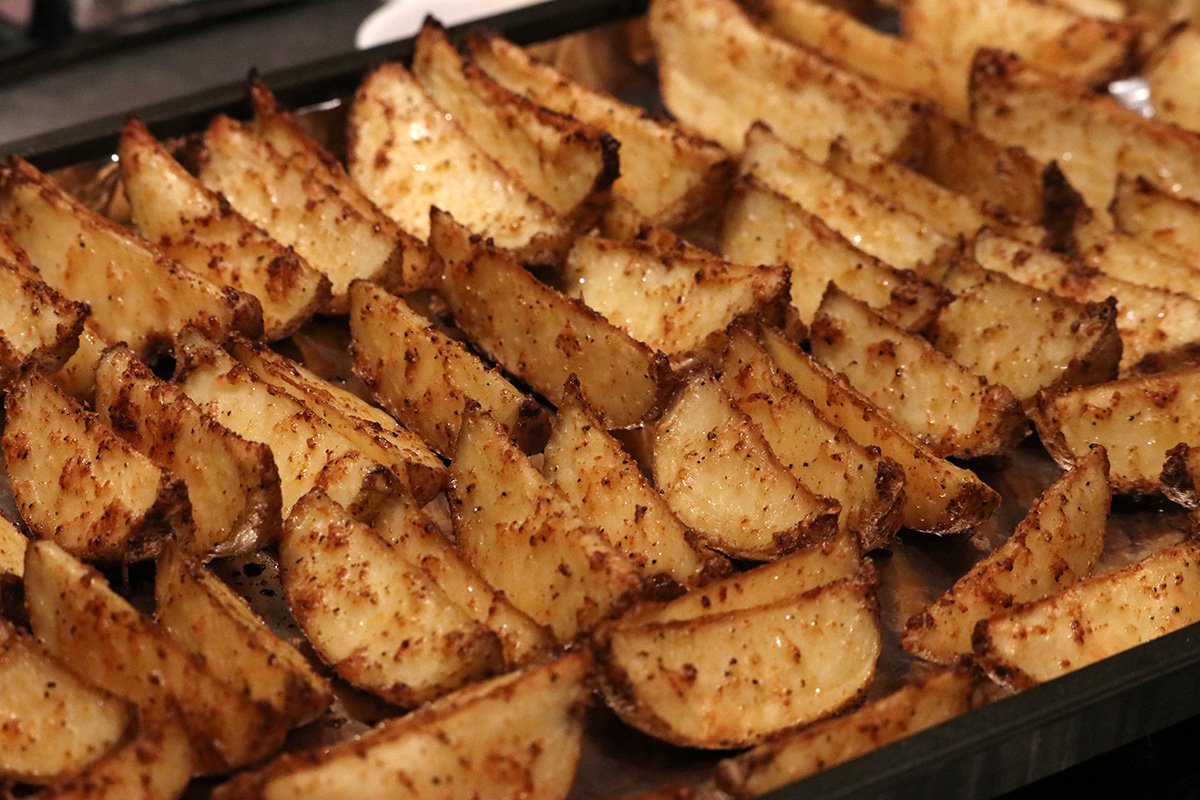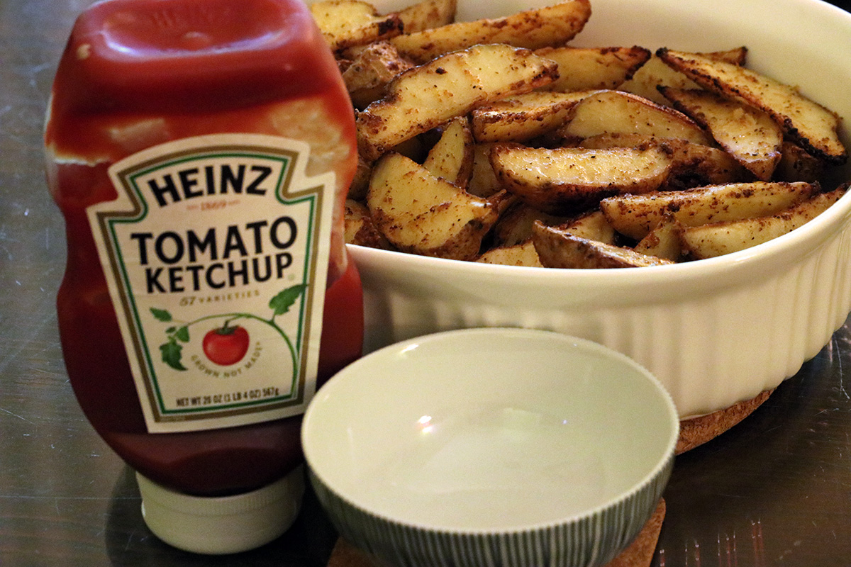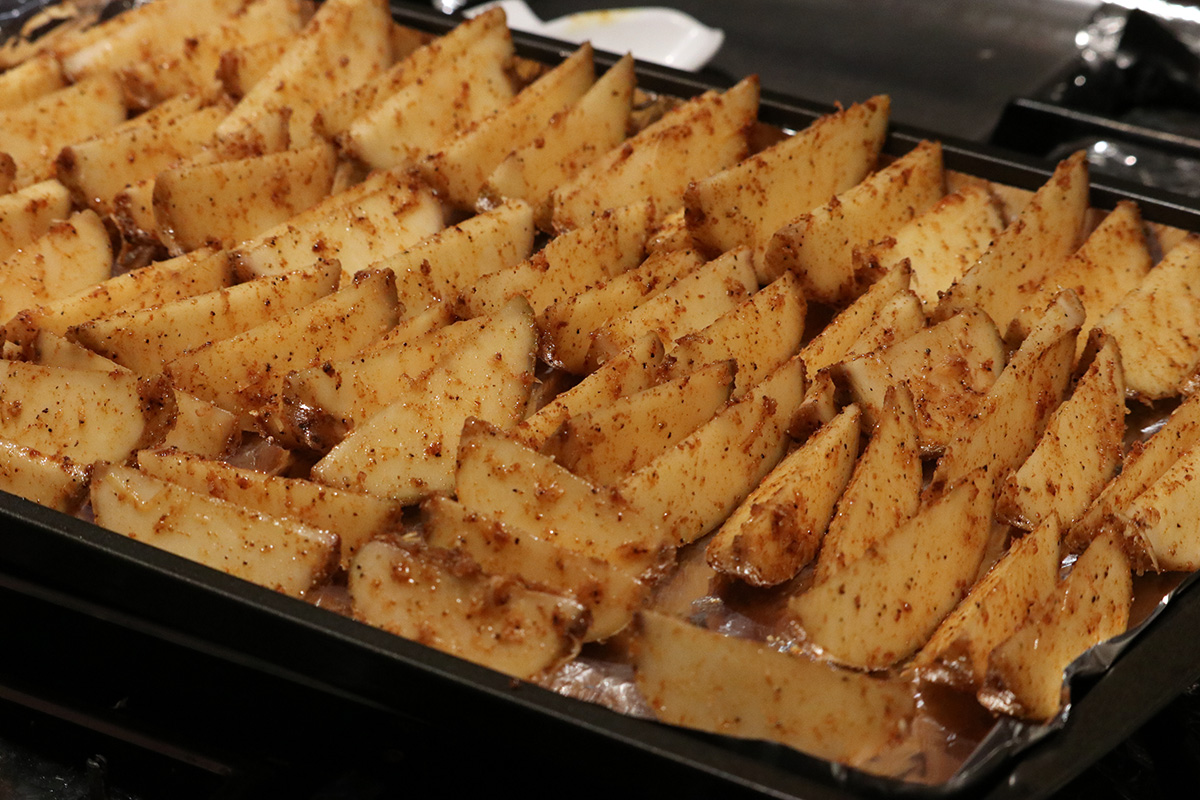 i used up the rest of my white potatoes, turned them into baked potato wedges. it became my dinner, since it was filling enough i didn't want to eat anything more afterwards. white potatoes is simply not good for fries/wedges, because the potatoes are waxy and don't lose their shape, so they don't have that nice fluffy interior.