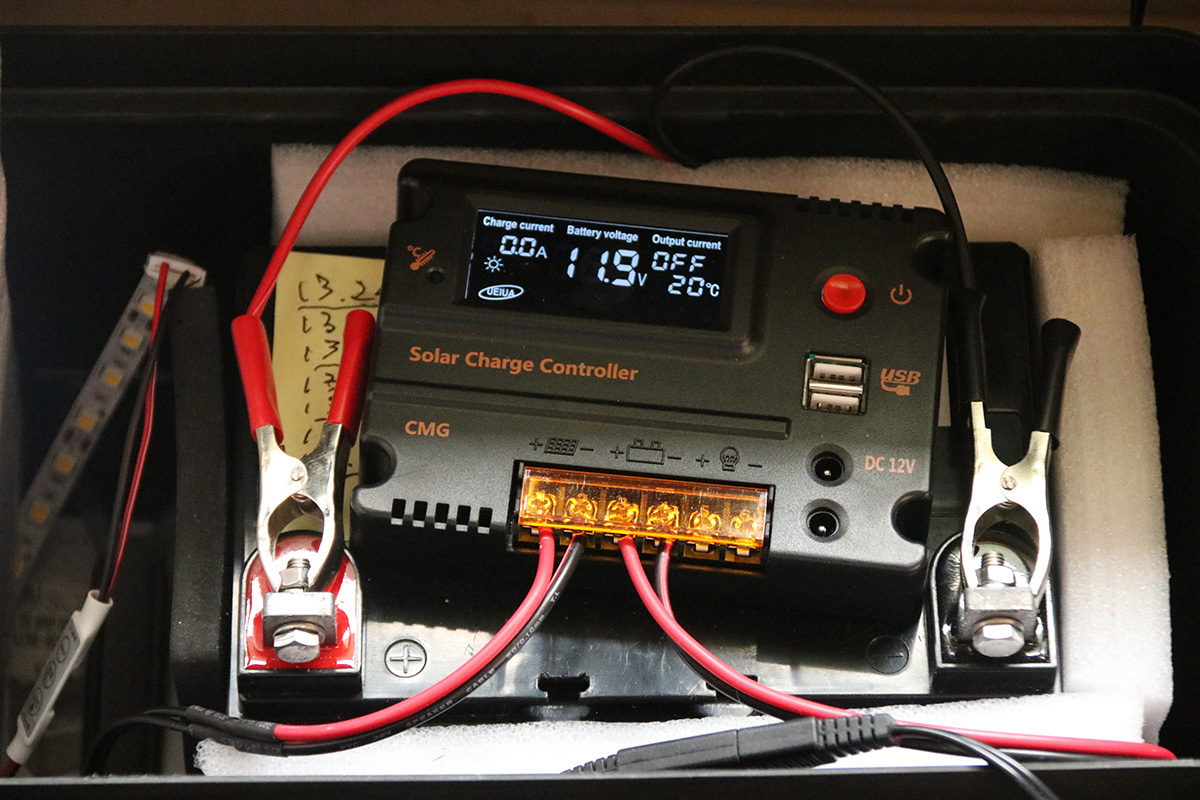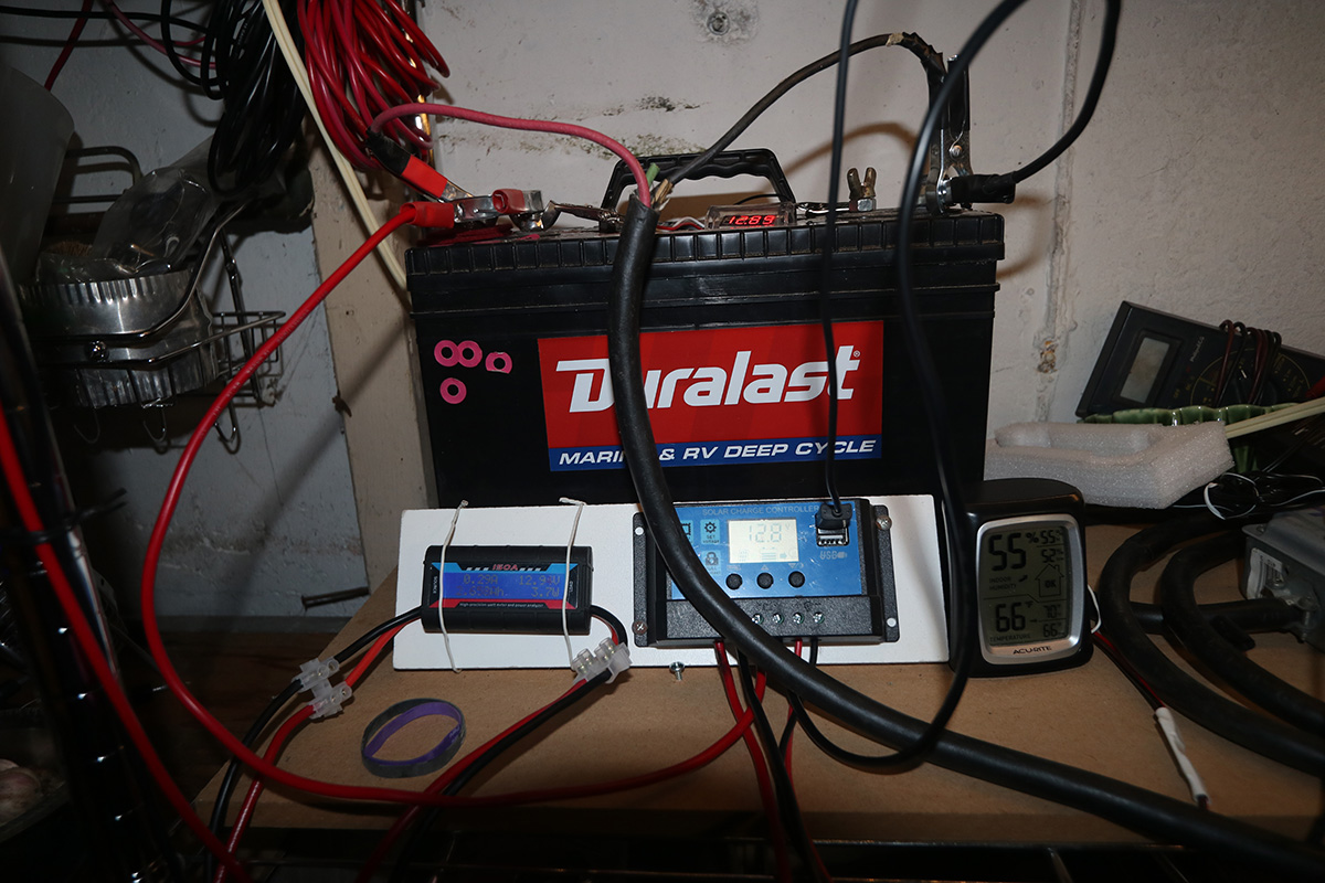 the solar battery in the sun room continues to decrease in charge (now at 11.9V), the 1.5V solar panel unable to keep up, especially when we don't get enough sunlight. we're still waiting on our 50V solar panel that we ordered back on september 25th, the latest update shows it finally shipped, hopefully it'll arrive soon. the larger marine battery in the basement has a charge of 12.89V.
