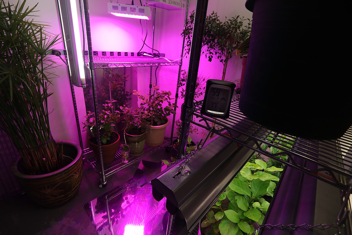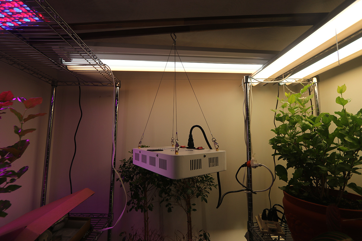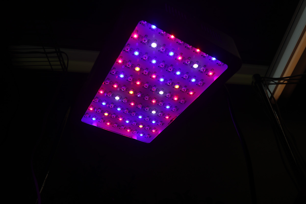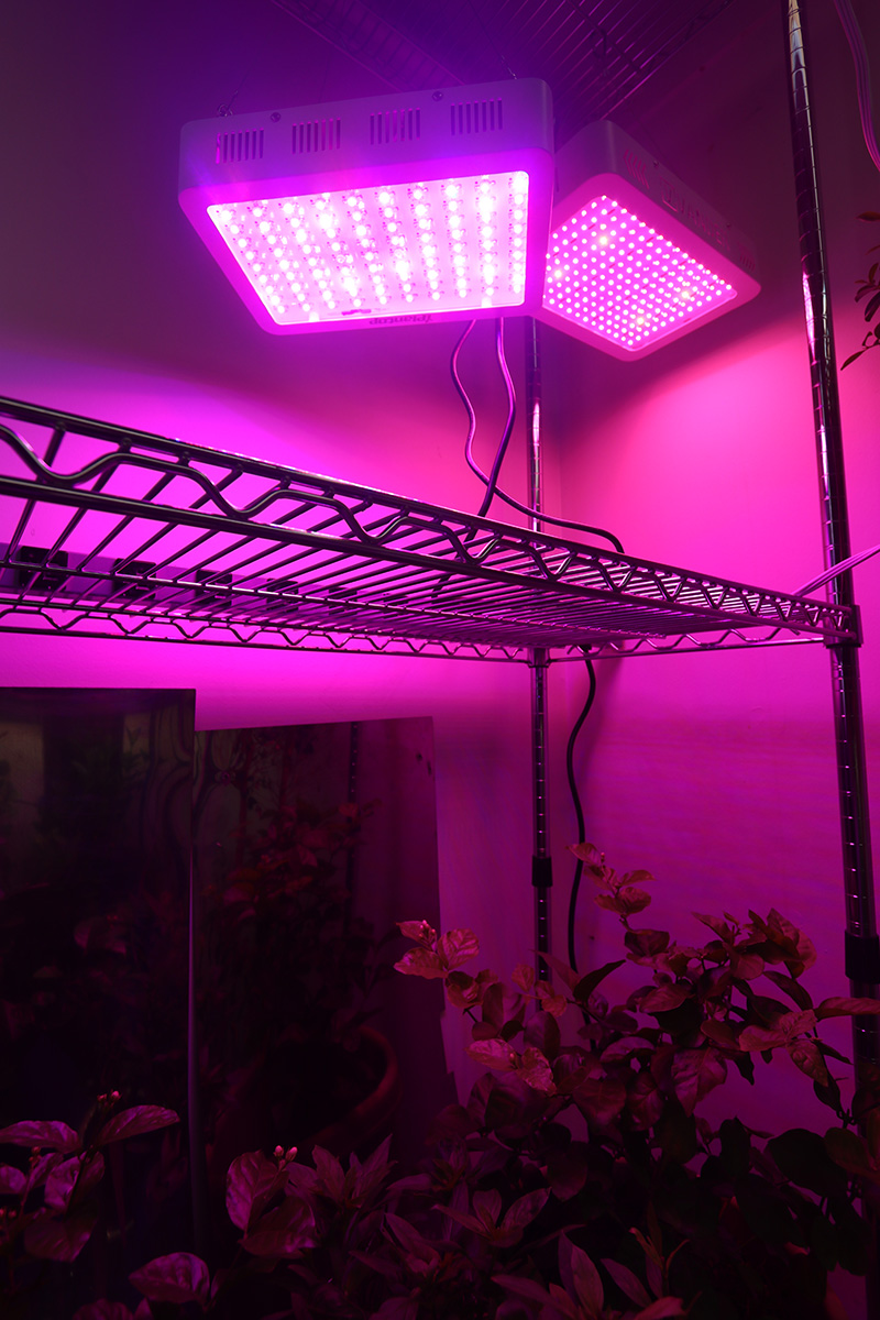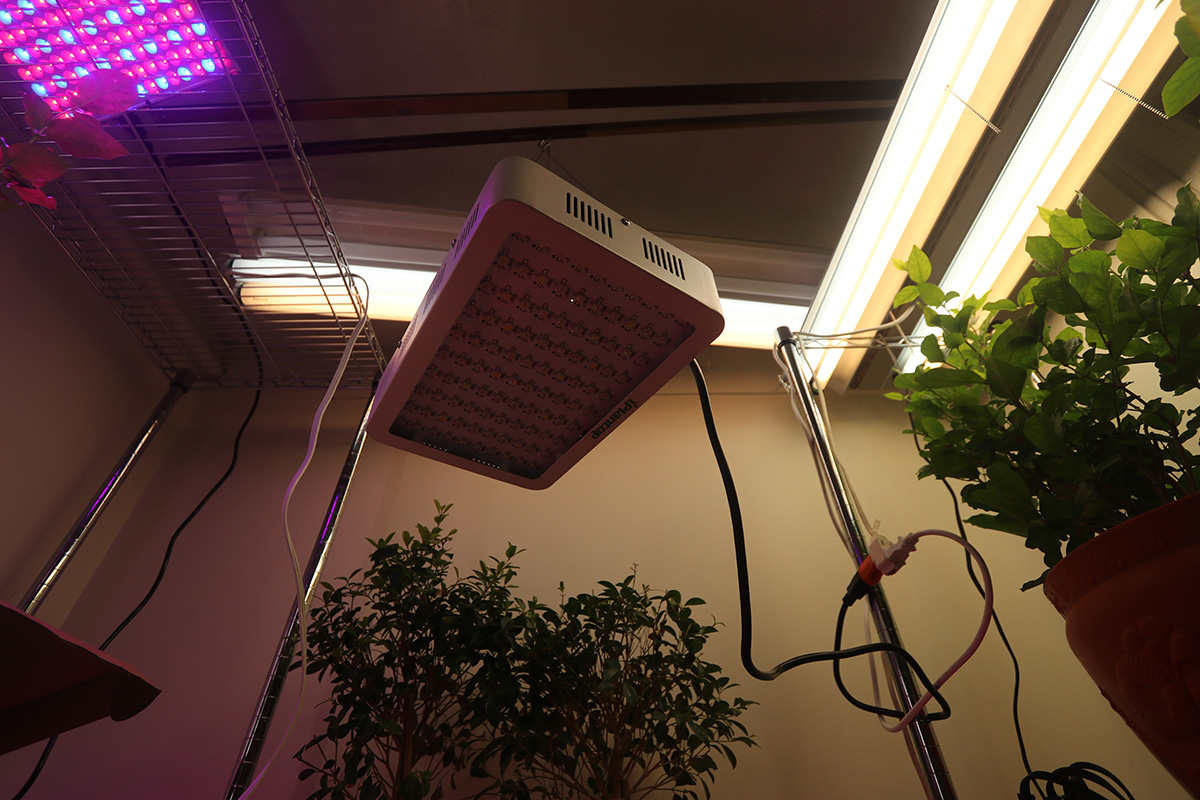 finally i saw the new iplantop led grow light. turning it on i noticed 2 things: it was definitely more quiet than the xeccon grow light (despite having 2 fans) and it was much brighter. the color is a little different, more blurple, which is more straining on the eyes, when compared to the xeccon, which is more magenta-white. the iplantop has two settings, vegetative and bloom. vegetative is a combination of blue-red-white, while bloom is a solid red. while i was there i noticed some black caterpillar droppings on the thai basil; i found an inchworm which i released outside. before i left i hung the iplantop above one of the shelves and turned off the xeccon.
