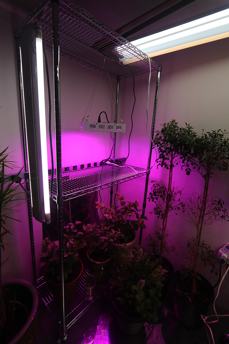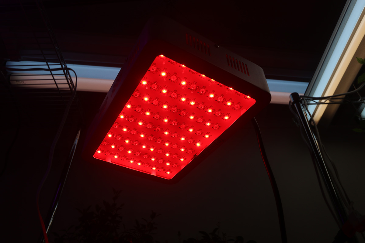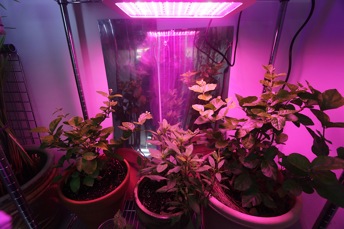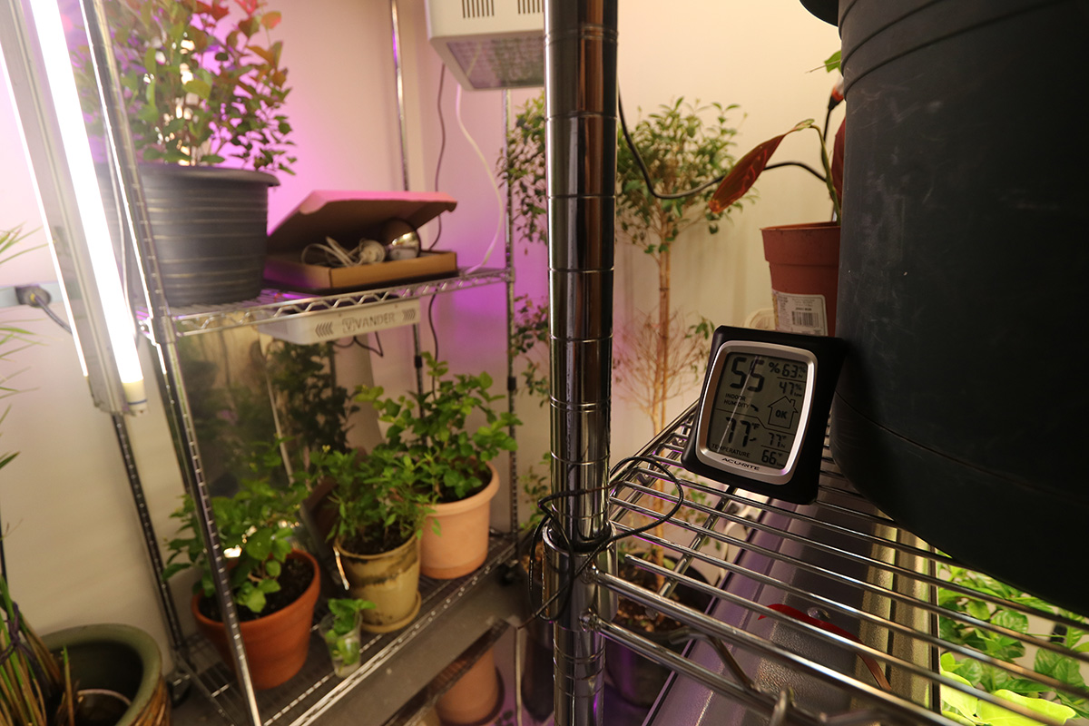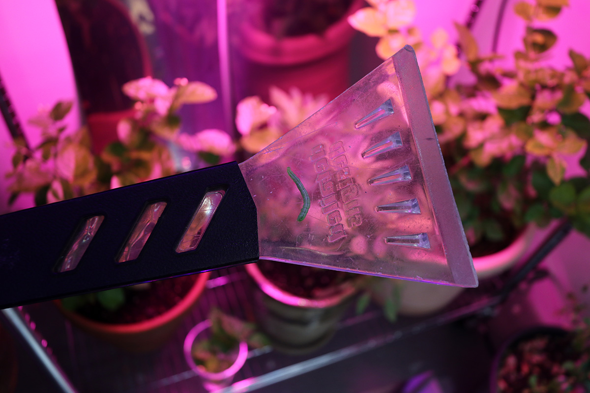 finally i saw the new iplantop led grow light. turning it on i noticed 2 things: it was definitely more quiet than the xeccon grow light (despite having 2 fans) and it was much brighter. the color is a little different, more blurple, which is more straining on the eyes, when compared to the xeccon, which is more magenta-white. the iplantop has two settings, vegetative and bloom. vegetative is a combination of blue-red-white, while bloom is a solid red. while i was there i noticed some black caterpillar droppings on the thai basil; i found an inchworm which i released outside. before i left i hung the iplantop above one of the shelves and turned off the xeccon.
