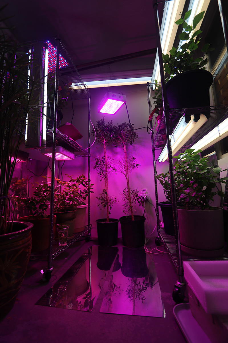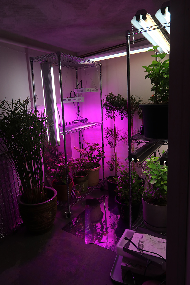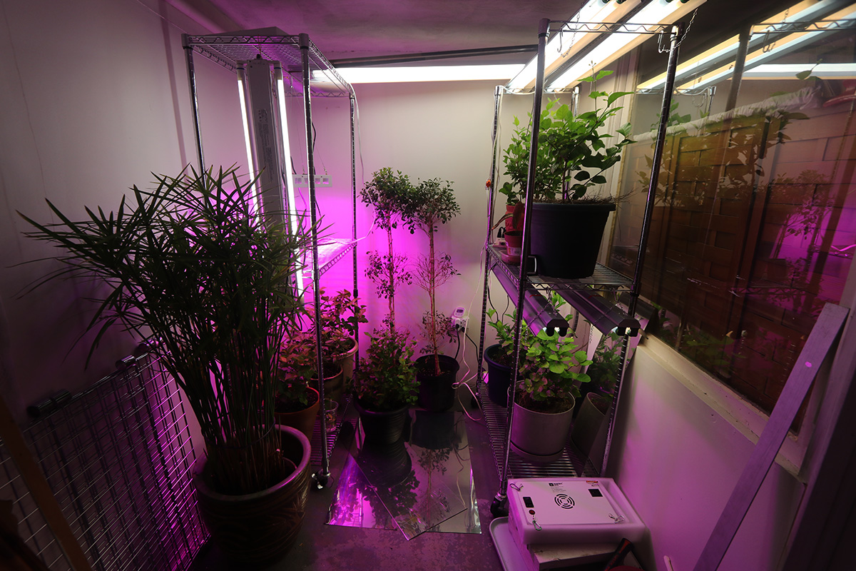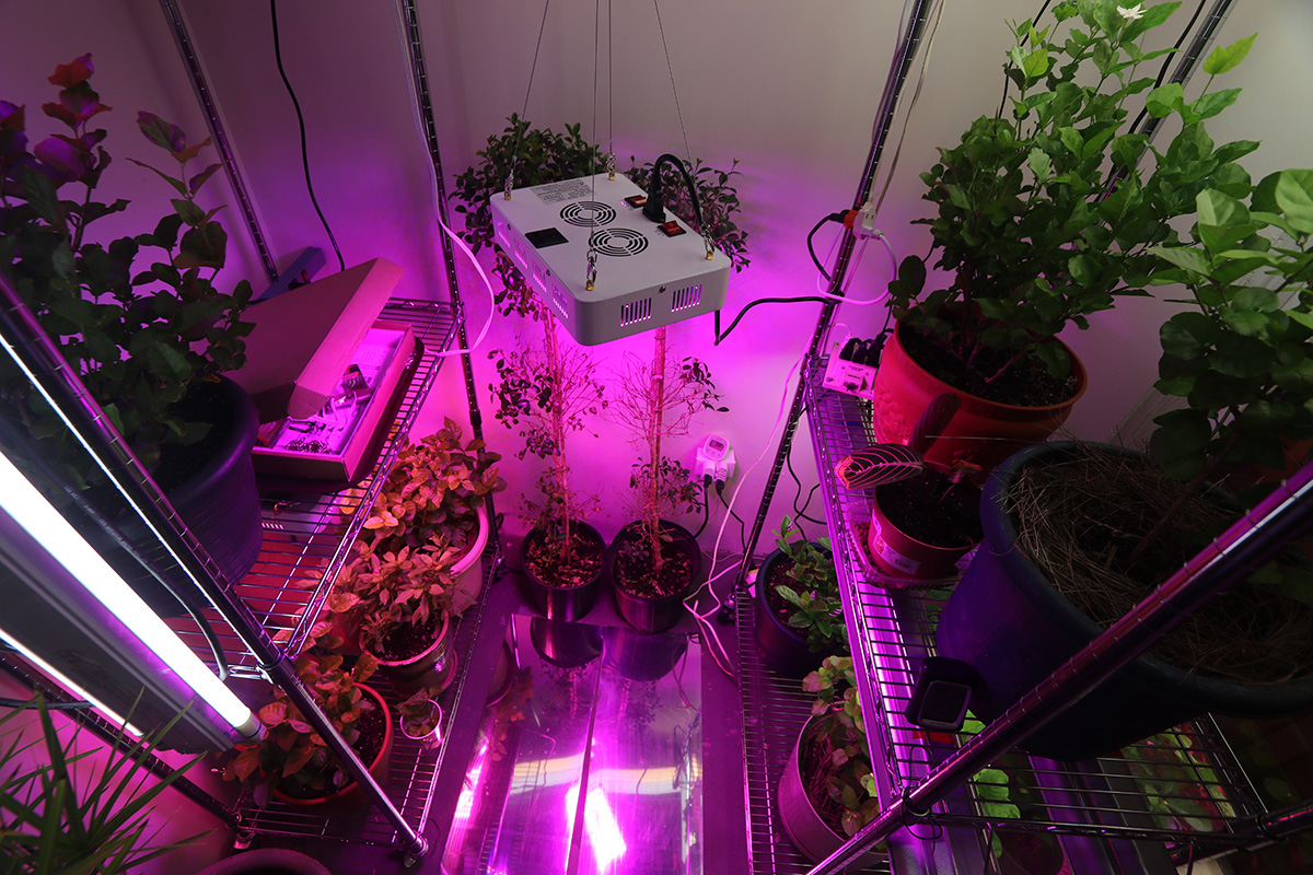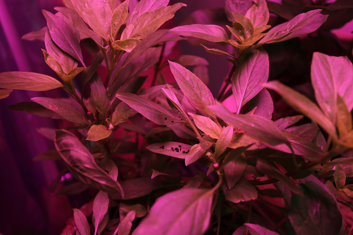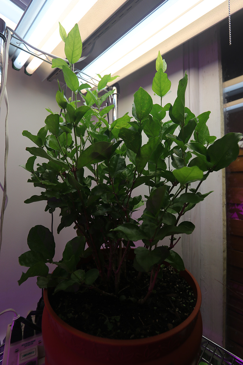 finally i saw the new iplantop led grow light. turning it on i noticed 2 things: it was definitely more quiet than the xeccon grow light (despite having 2 fans) and it was much brighter. the color is a little different, more blurple, which is more straining on the eyes, when compared to the xeccon, which is more magenta-white. the iplantop has two settings, vegetative and bloom. vegetative is a combination of blue-red-white, while bloom is a solid red. while i was there i noticed some black caterpillar droppings on the thai basil; i found an inchworm which i released outside. before i left i hung the iplantop above one of the shelves and turned off the xeccon.
