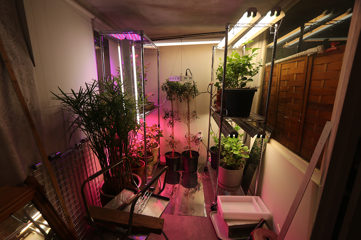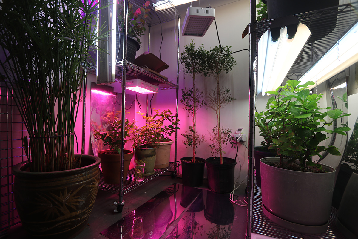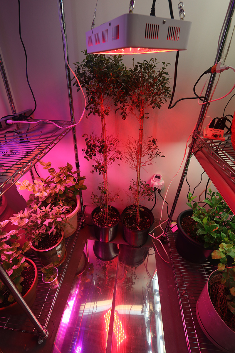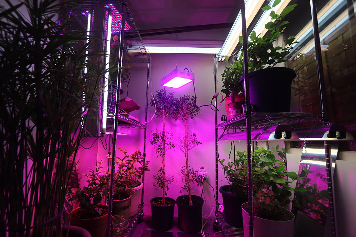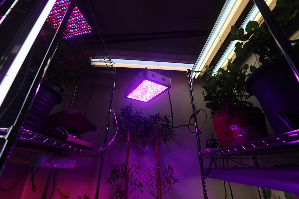 finally i saw the new iplantop led grow light. turning it on i noticed 2 things: it was definitely more quiet than the xeccon grow light (despite having 2 fans) and it was much brighter. the color is a little different, more blurple, which is more straining on the eyes, when compared to the xeccon, which is more magenta-white. the iplantop has two settings, vegetative and bloom. vegetative is a combination of blue-red-white, while bloom is a solid red. while i was there i noticed some black caterpillar droppings on the thai basil; i found an inchworm which i released outside. before i left i hung the iplantop above one of the shelves and turned off the xeccon.