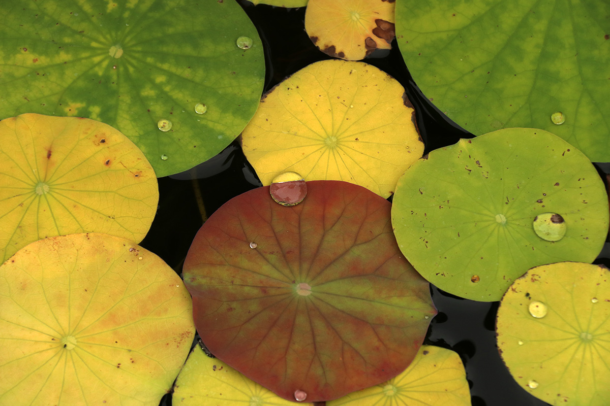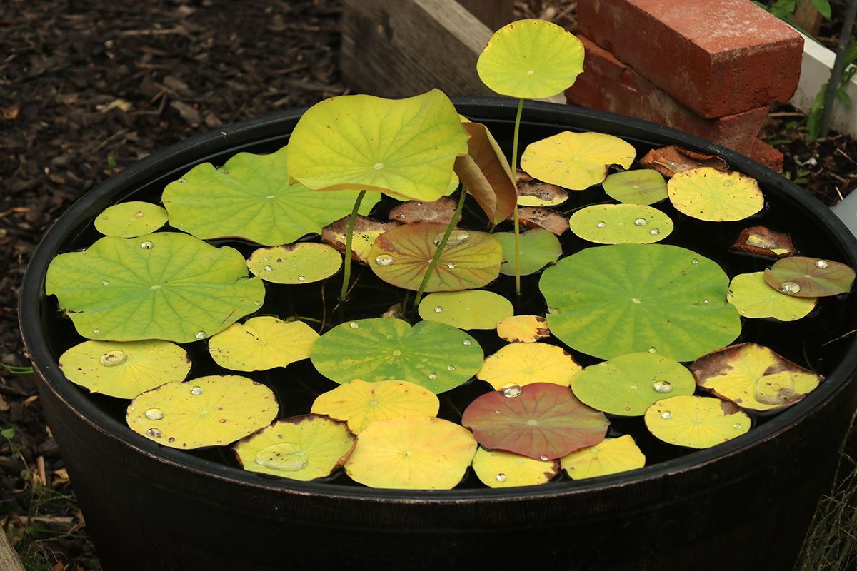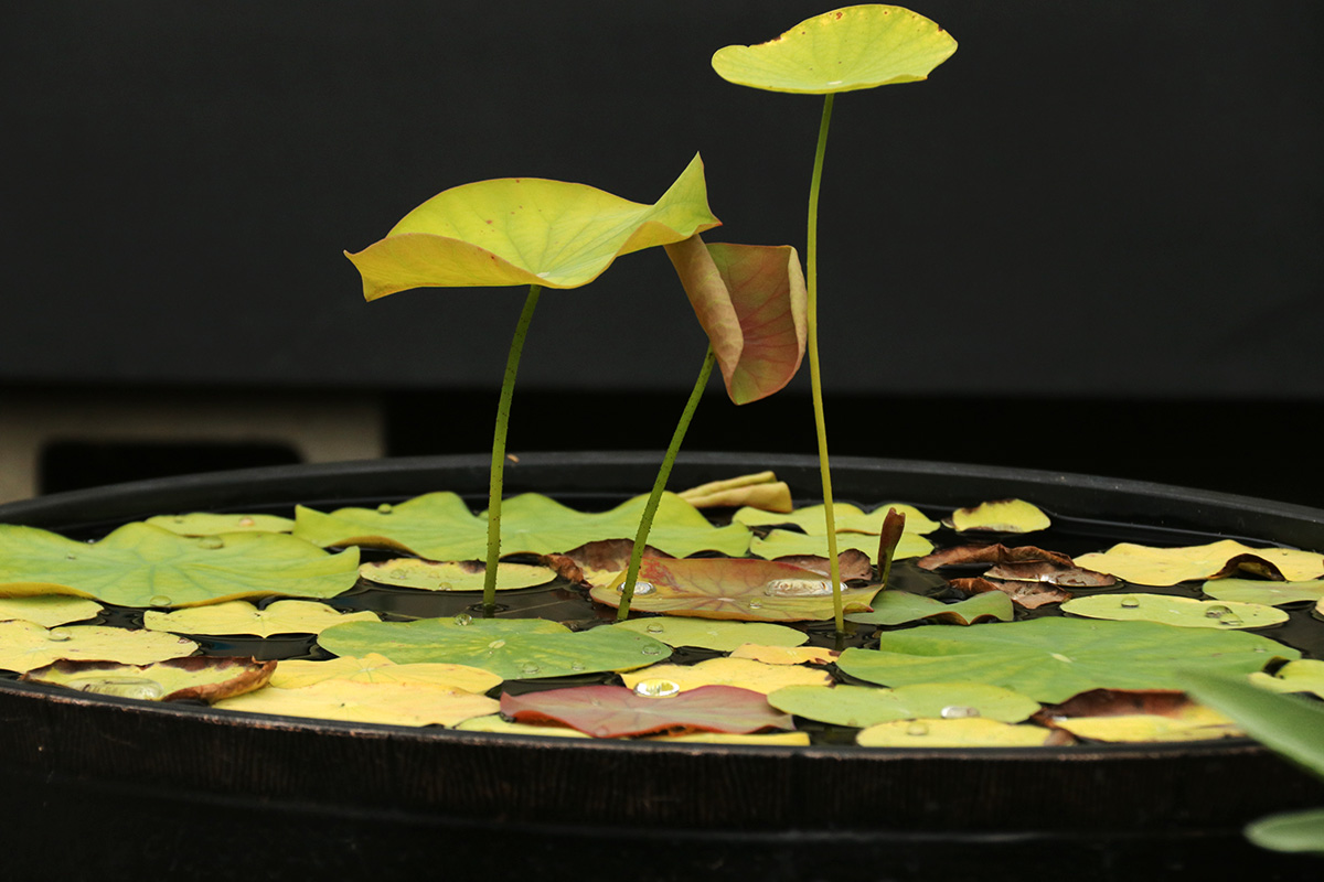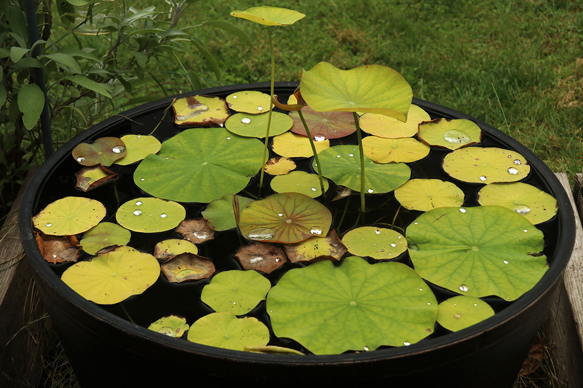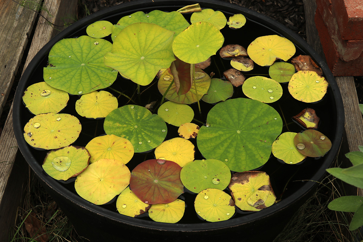 the third lotus aerial leaf had started to unfurl. i'm trying to enjoy the lotuses as much as possible since their days are numbered. later this week the night time temperature is supposed to drop into the 40's, who knows if the lotuses can after survive after that. a lot of the smaller floating leaves have already yellowed, only the lotus with the aerial leaves seem to be strong enough to withstand the dropping temperature and stay green. whenever i can, i search for potential containers to house the lotuses for next season.