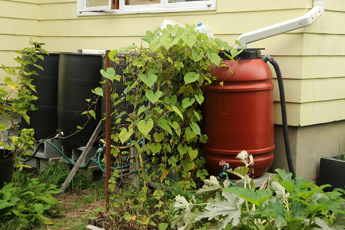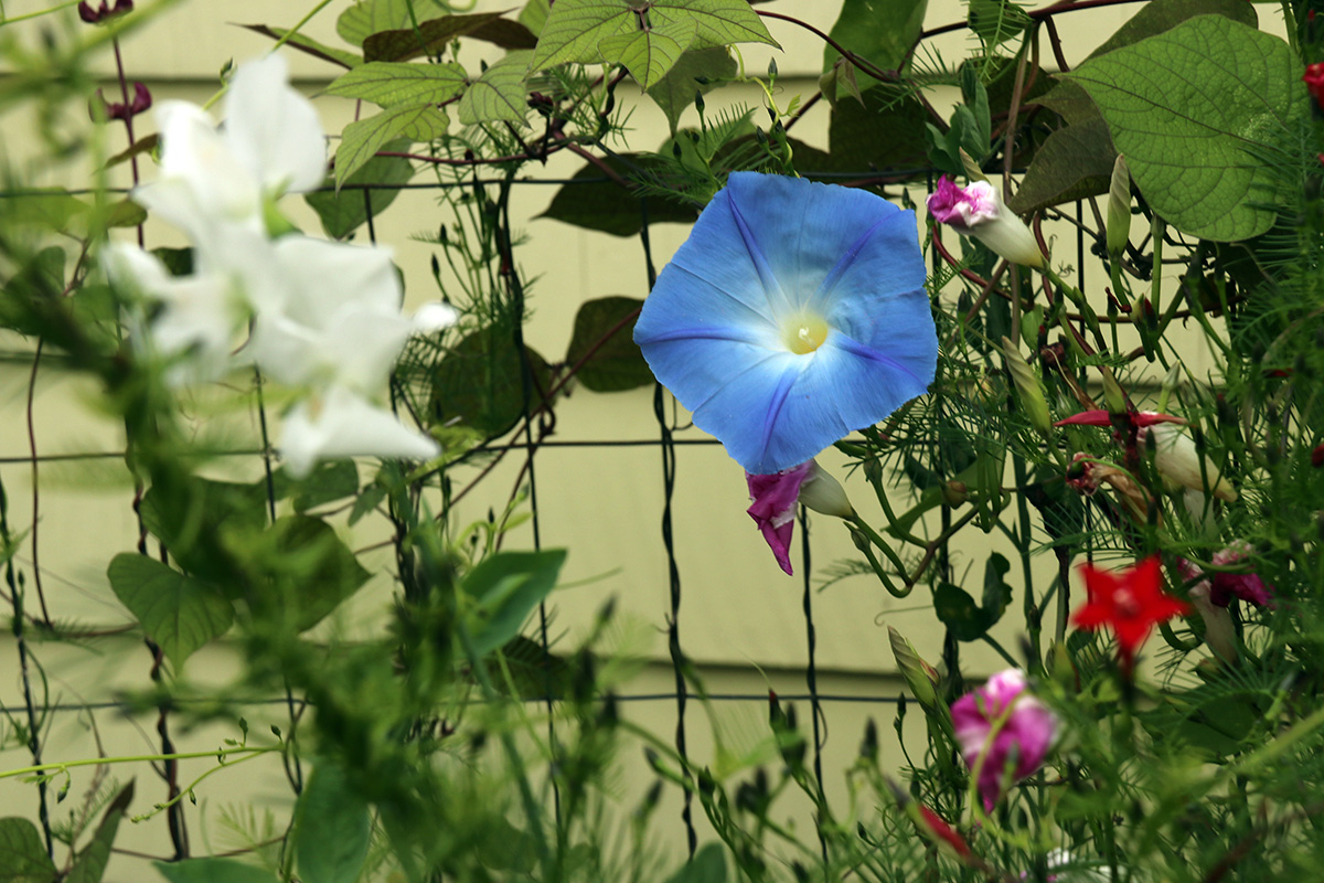 i did a garden survey first before i headed to the basement. it'd rained enough yesterday to fill all the rain barrels. the grass patches were still wet that i didn't need to water them. the day was overcast so the blue morning glory flowers were still opened. while walking around the backyard i flushed out a rabbit who hopped to the southeastern corner of the yard. i grabbed a long bamboo stick and chased after it. ever since we put in buried fencing to keep the woodchuck out, it had also had an unintended benefit of keeping out the rabbits as well, so it's been a while since i saw a rabbit in the backyard. i didn't see it but the jostling of logs told me it hopped through a known gap in the fence area. when we have time we'll find a better way to patch up that hole instead of just piling up a bunch of logs.