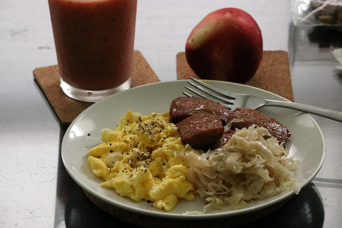 felt inspired this morning, made a slightly more elaborate lunch of scrambled eggs with parmesan cheese, korean kielbasa, homemade aged sauerkraut, a mixed fruit smoothie, and a nectarine. i never tried the korean kielbasa before, it didn't taste that good, had an unfamiliar sweet flavor, kind of reminds me of imitation market basket chinese sausage (which my father really likes, but i prefer the real stuff from chinatown).