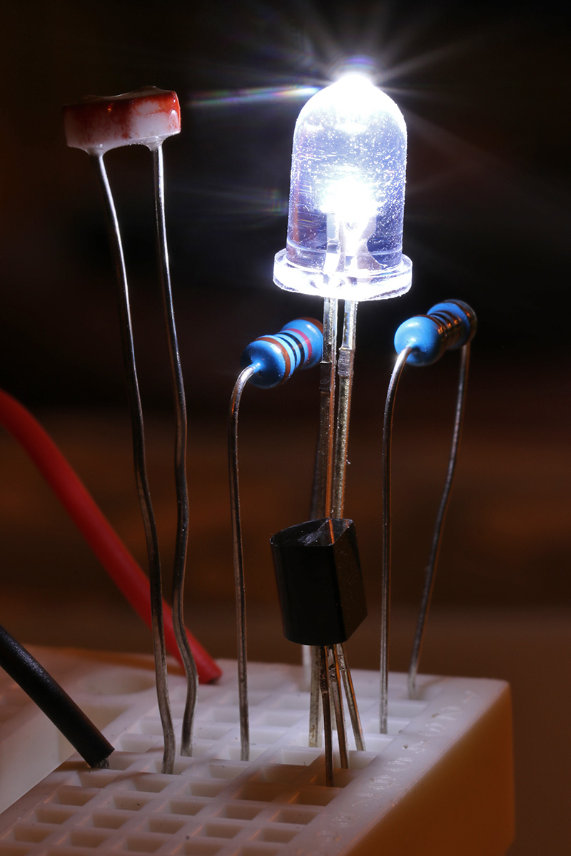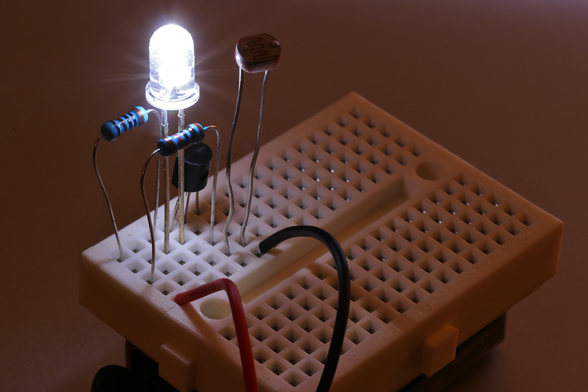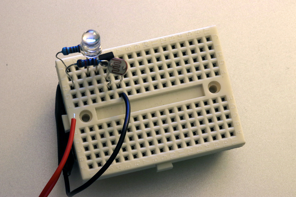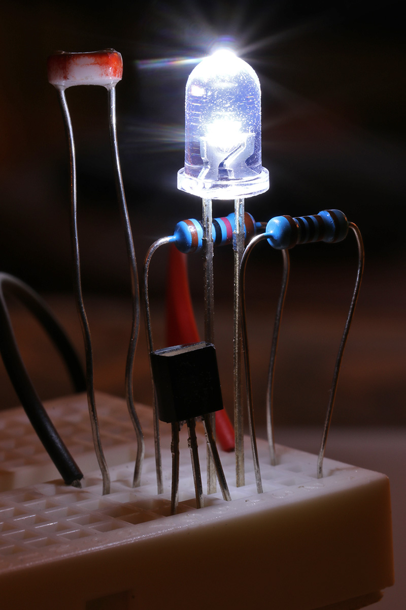 i've been studying the darkness sensing circuitry and managed to streamline it to the point where it doesn't use any wire leads (other than the 2 leads from the 9V battery). i'm just a few steps shy of building my own solar-powered led night light. it's more of a learning exercise since i can easily buy one from any dollar store.