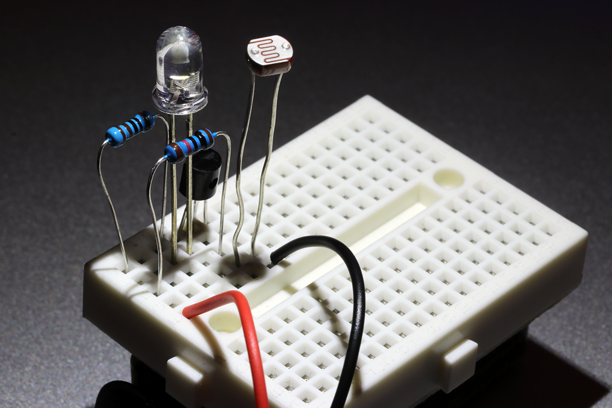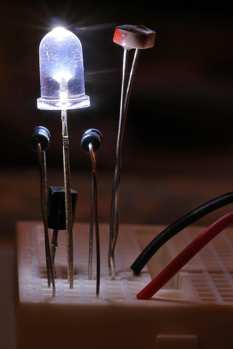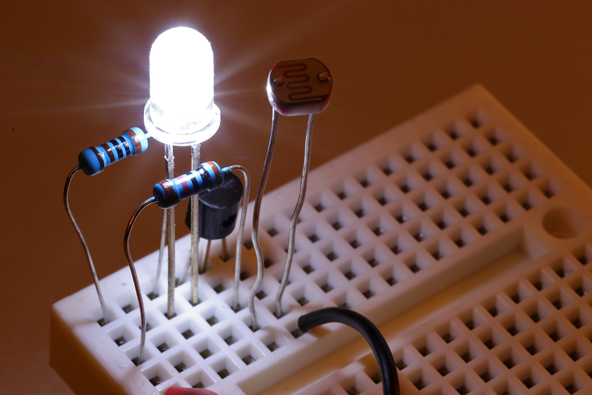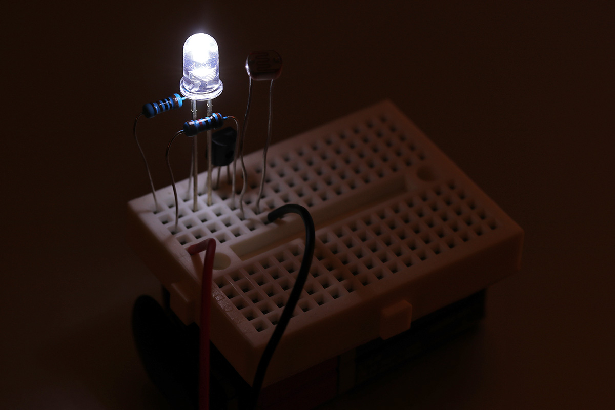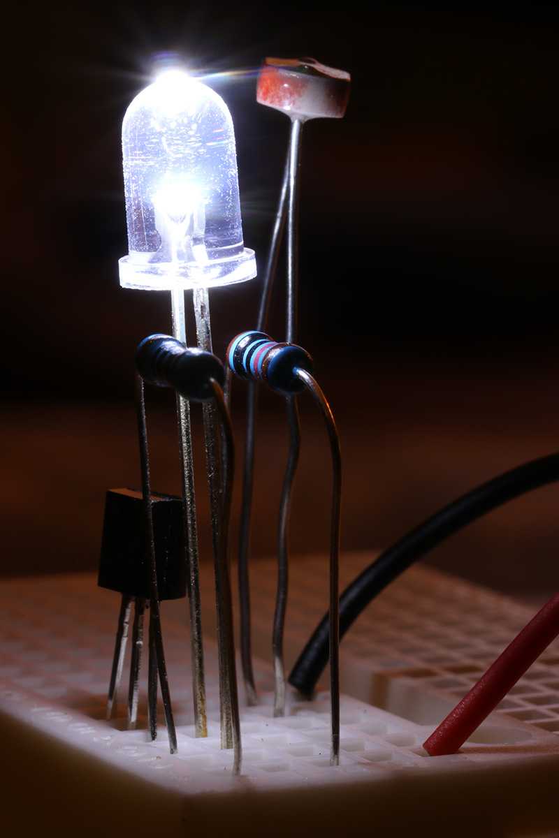 i've been studying the darkness sensing circuitry and managed to streamline it to the point where it doesn't use any wire leads (other than the 2 leads from the 9V battery). i'm just a few steps shy of building my own solar-powered led night light. it's more of a learning exercise since i can easily buy one from any dollar store.