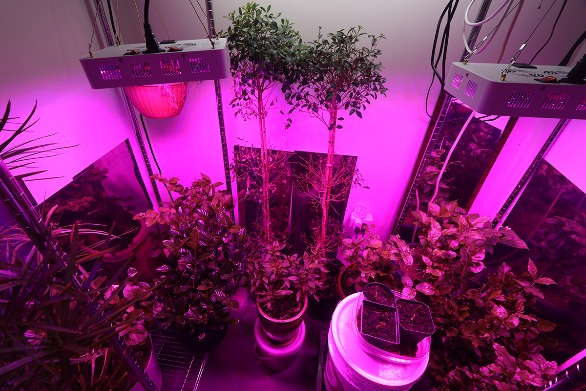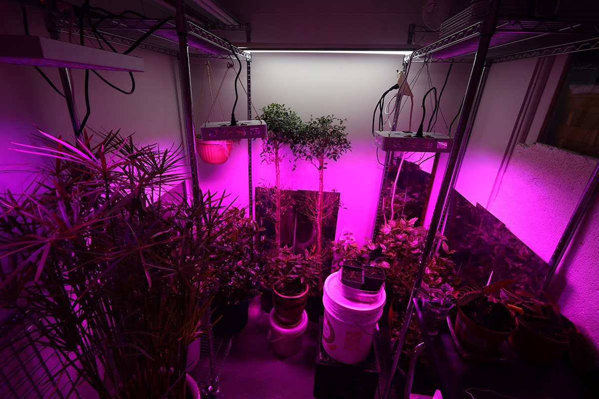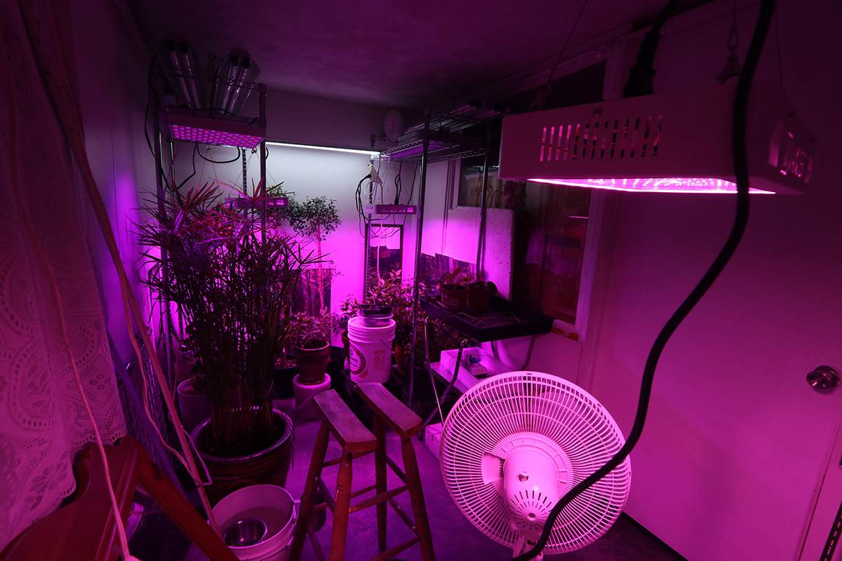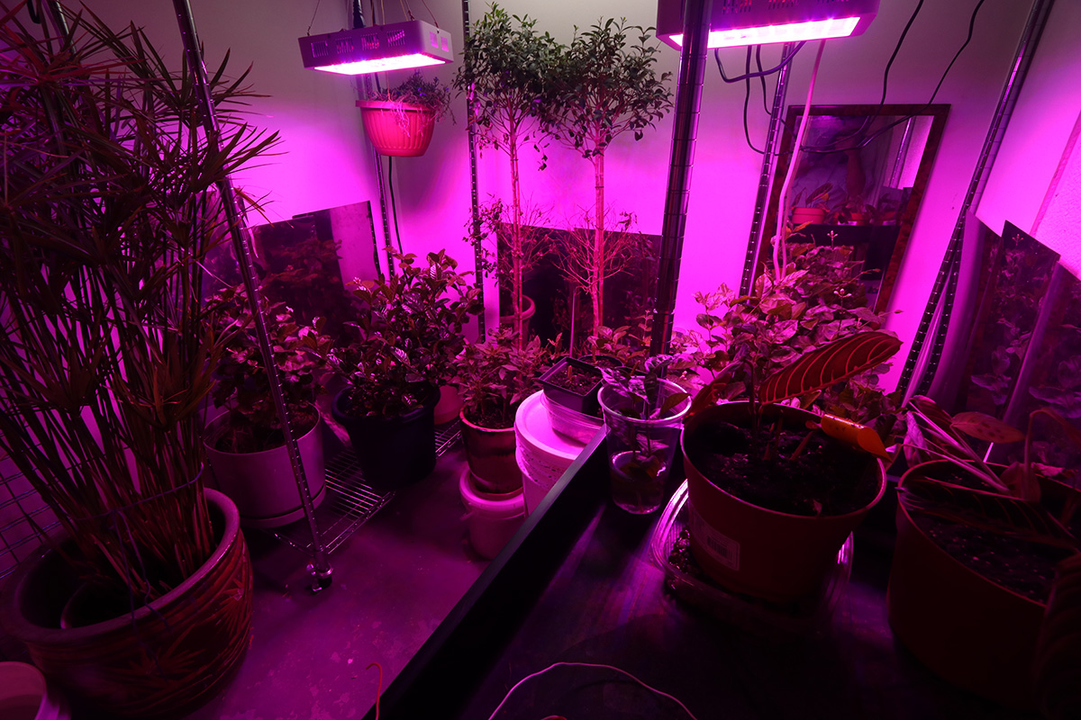 with the dual iplantop grow lights glowing (for a combined actual wattage of 320W) we actually don't need any of the T8 fluorescent lights so we turned them off. the only other lights is a 40W led shop light that goes over the two topiary ficus bushes and a square 45W grow light that hangs suspended from above the tall water reed.