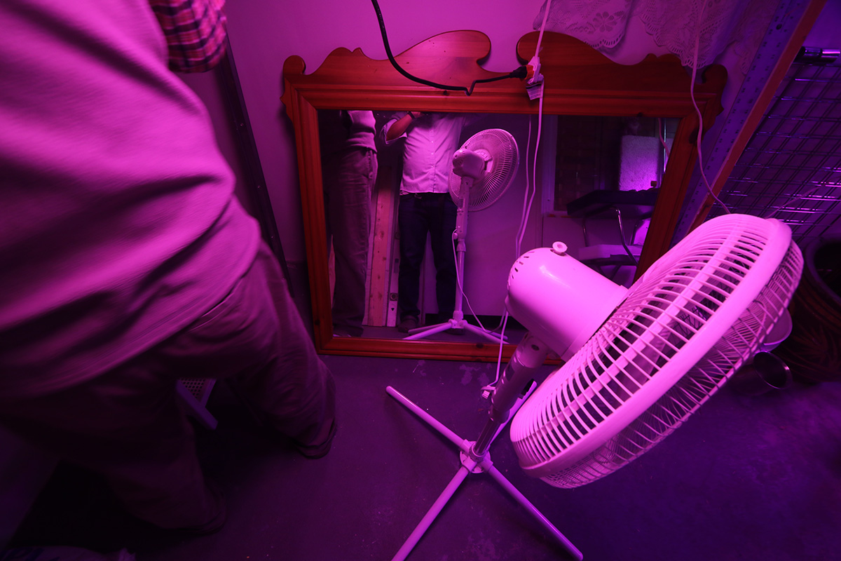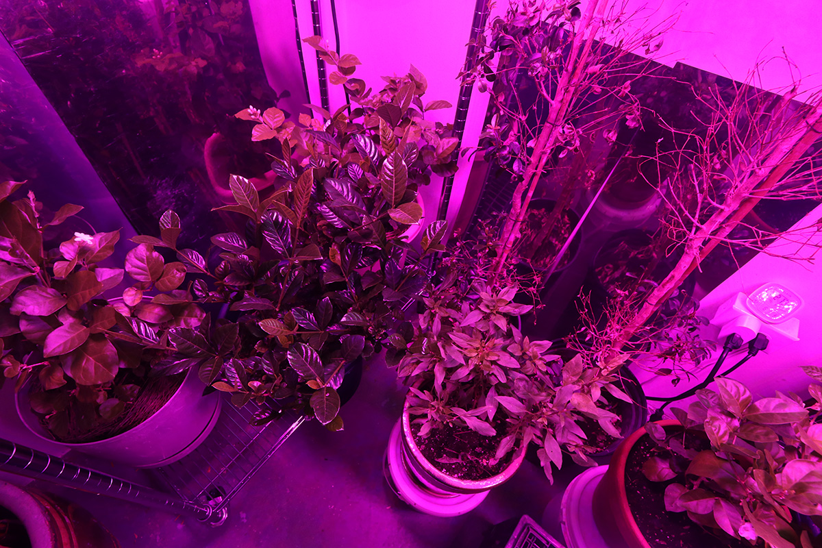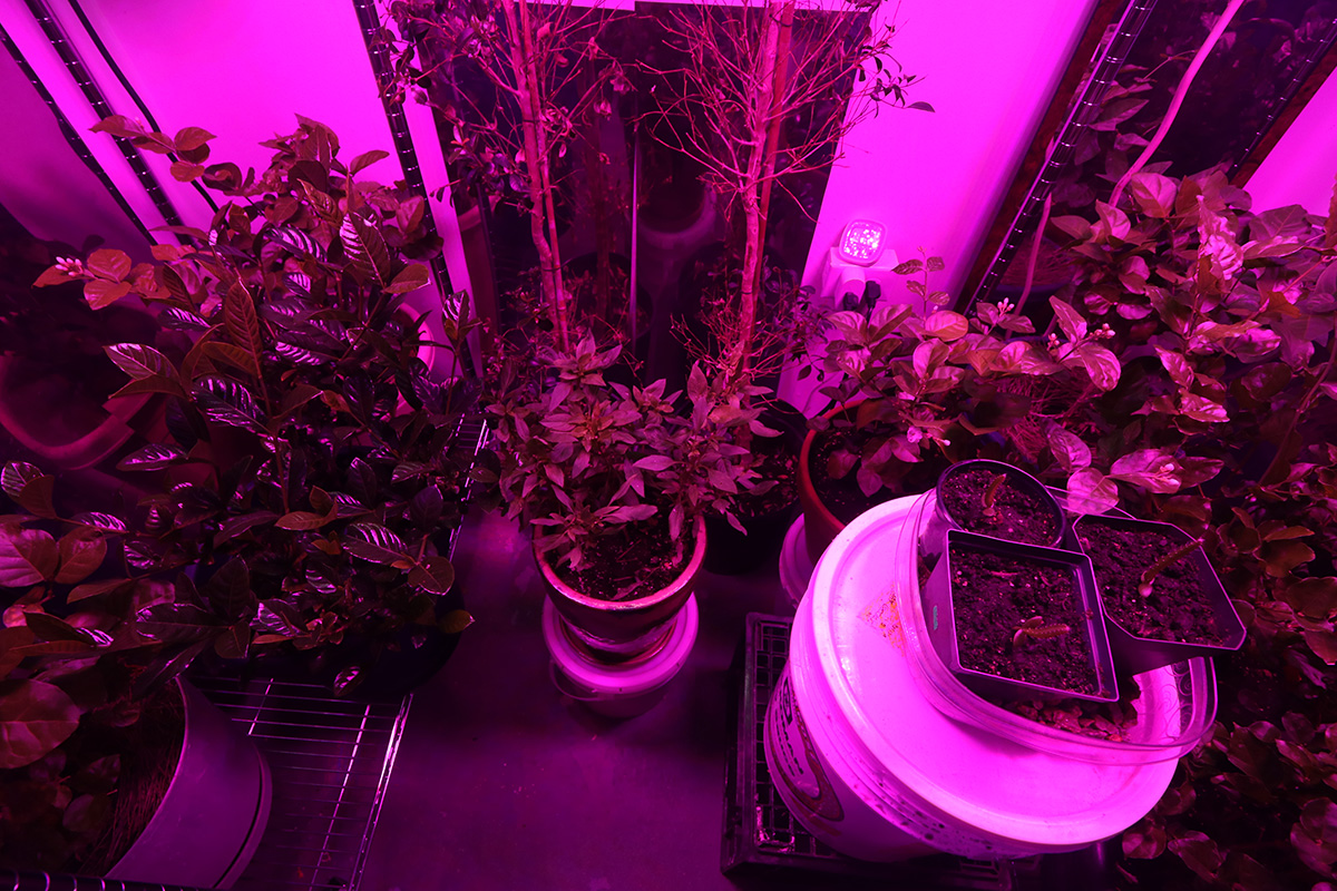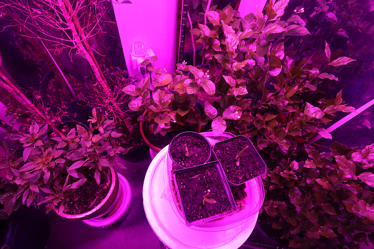 with the dual iplantop grow lights glowing (for a combined actual wattage of 320W) we actually don't need any of the T8 fluorescent lights so we turned them off. the only other lights is a 40W led shop light that goes over the two topiary ficus bushes and a square 45W grow light that hangs suspended from above the tall water reed.