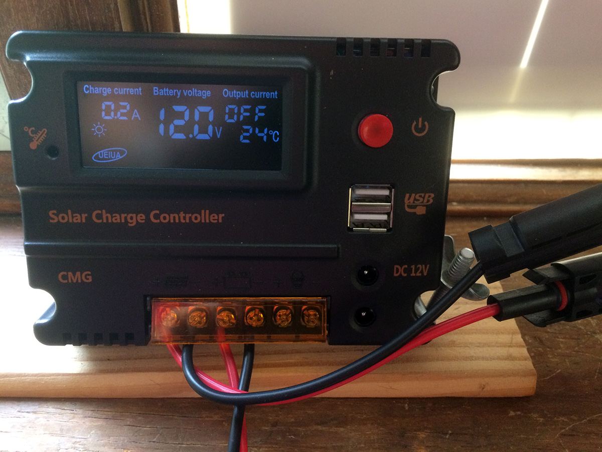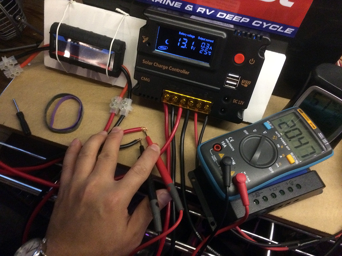 when i measured the 50W solar panel with the multimeter beforehand, it read close to 18V. however, when i connected it to the CMG-2420, the controller read 12V. that's when i realized the controller voltage shown is actually for the battery, not the solar panel. to see that, i needed a wattmeter to be connected between the panel and the controller (unfortunately my father took the spare wattmeter to the cafe to work on the wiring).