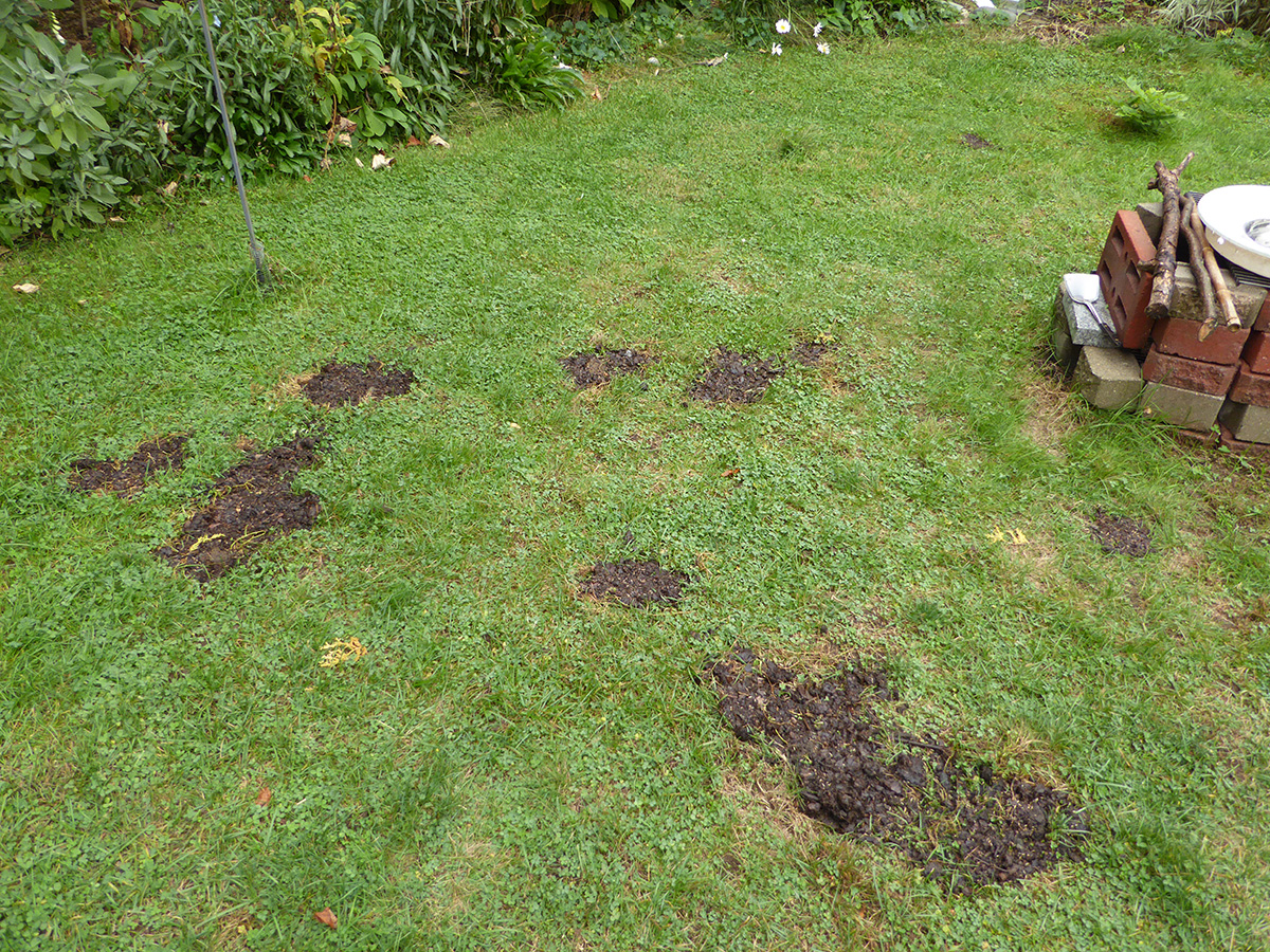 next i started patching all the bald spots in the backyard. all of them came courtesy of my sister's dog peeing on the lawn, a patch of yellow for every place she went to the bathroom. i first raked the areas with a cultivator just to clear out the dead grass and loosen the dirt, then i added either some top soil or compost, before sowing the grass seeds, mixing everything together, then watering. i also had a bag of leftover commercial grass patch mixture (a combination of fertilizer, newspaper pulp, and seeds) that i used to patch a few larger spots underneath the maple tree. like the grass seeds, i'm not sure how viable this patch mixture is. i ended up using about a fifth of our rain water supply.