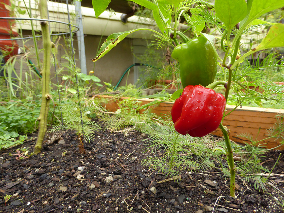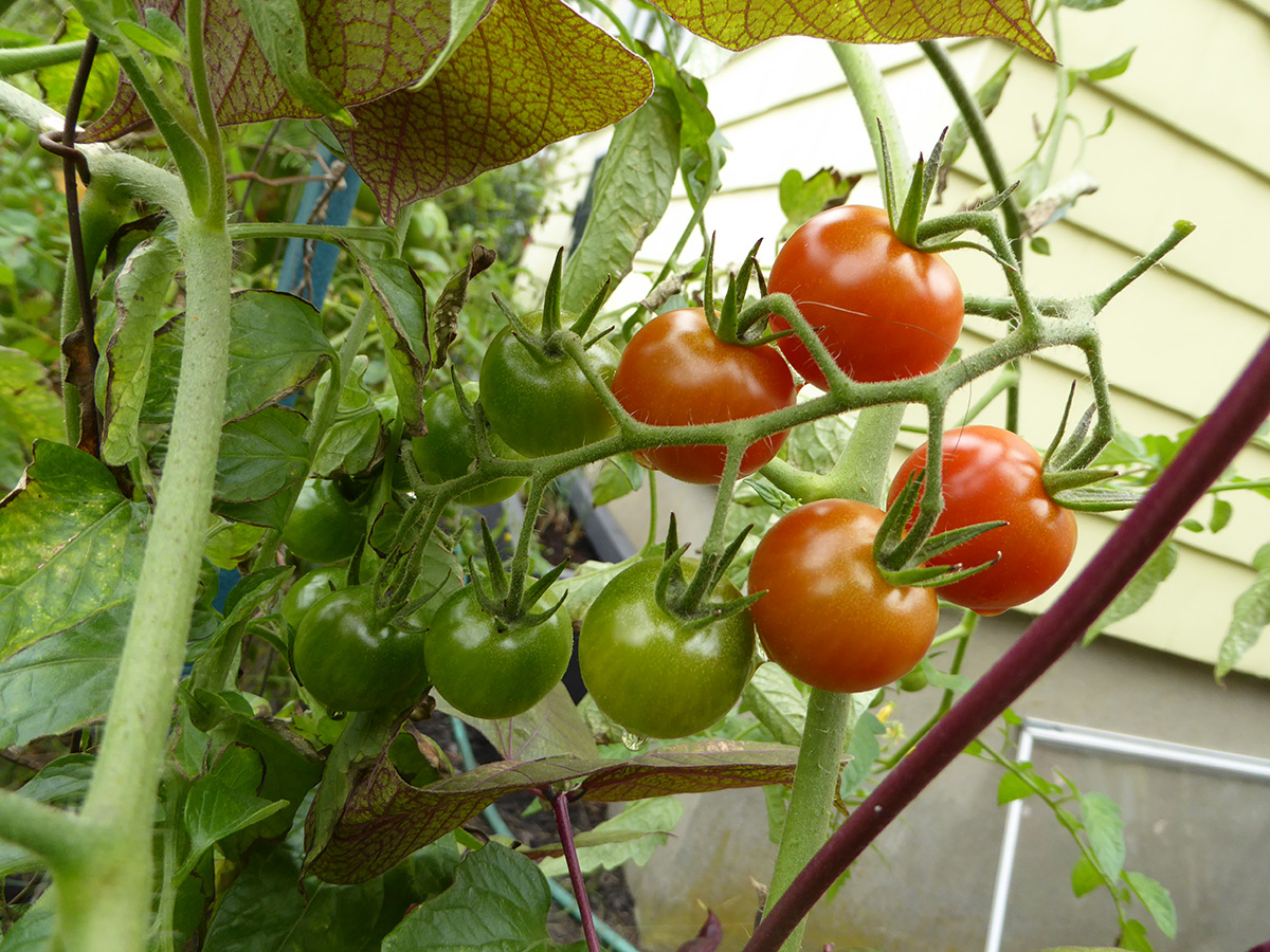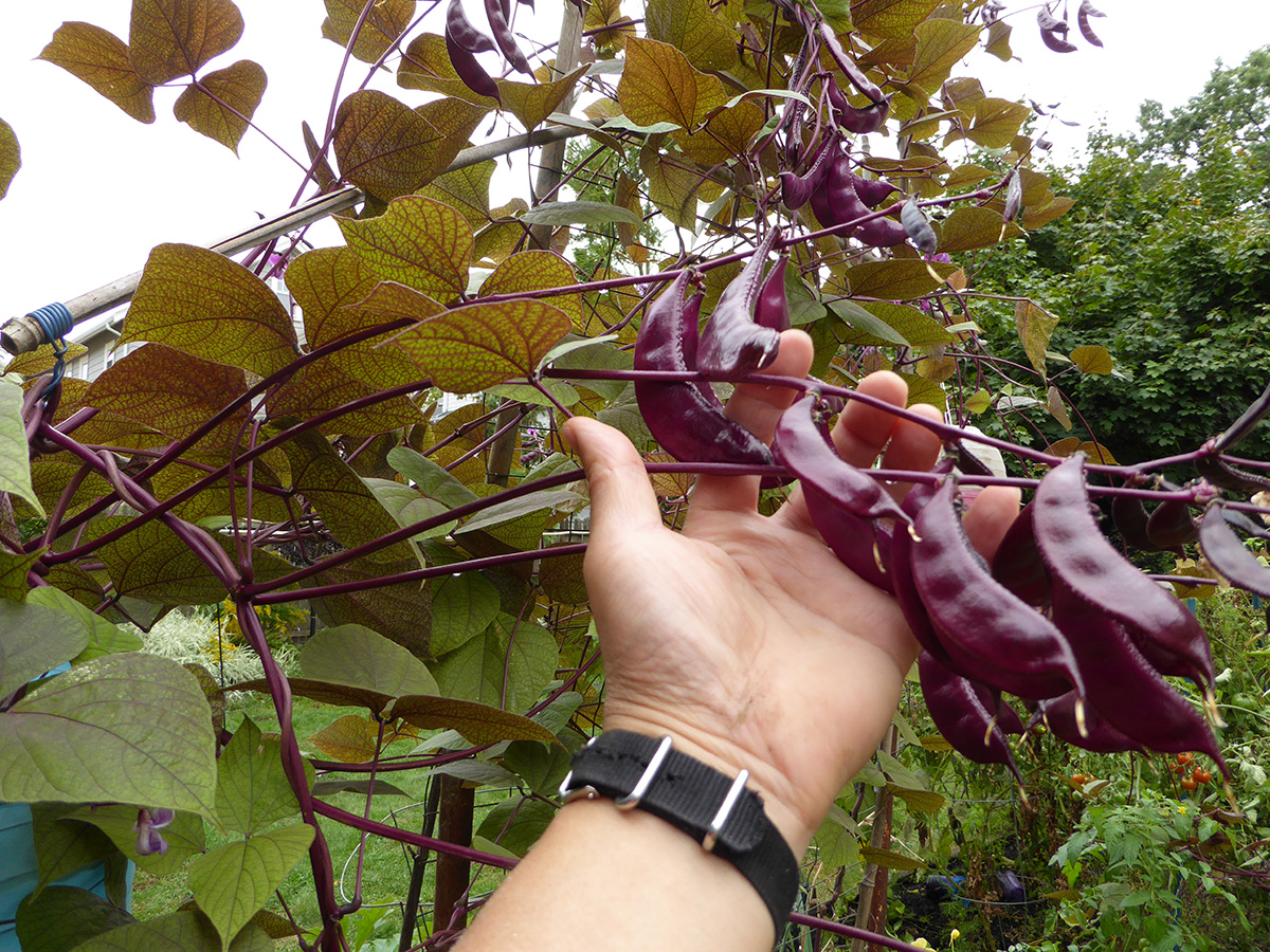 hyacinth beans are one of the plants that seem to be doing well this late in the growing season. a lot of the magenta-colored pea-style flowers have fallen off, leaving behind a pod that will hopefully produce some viable seeds for next season. cherry tomatoes are still growing, i pick a few to eat whenever i go out into the backyard. elsewhere, bigger sized tomatoes are on the vine, very slowly maturing. if we do get a frost, we'll collect all of them and let them ripen indoors.