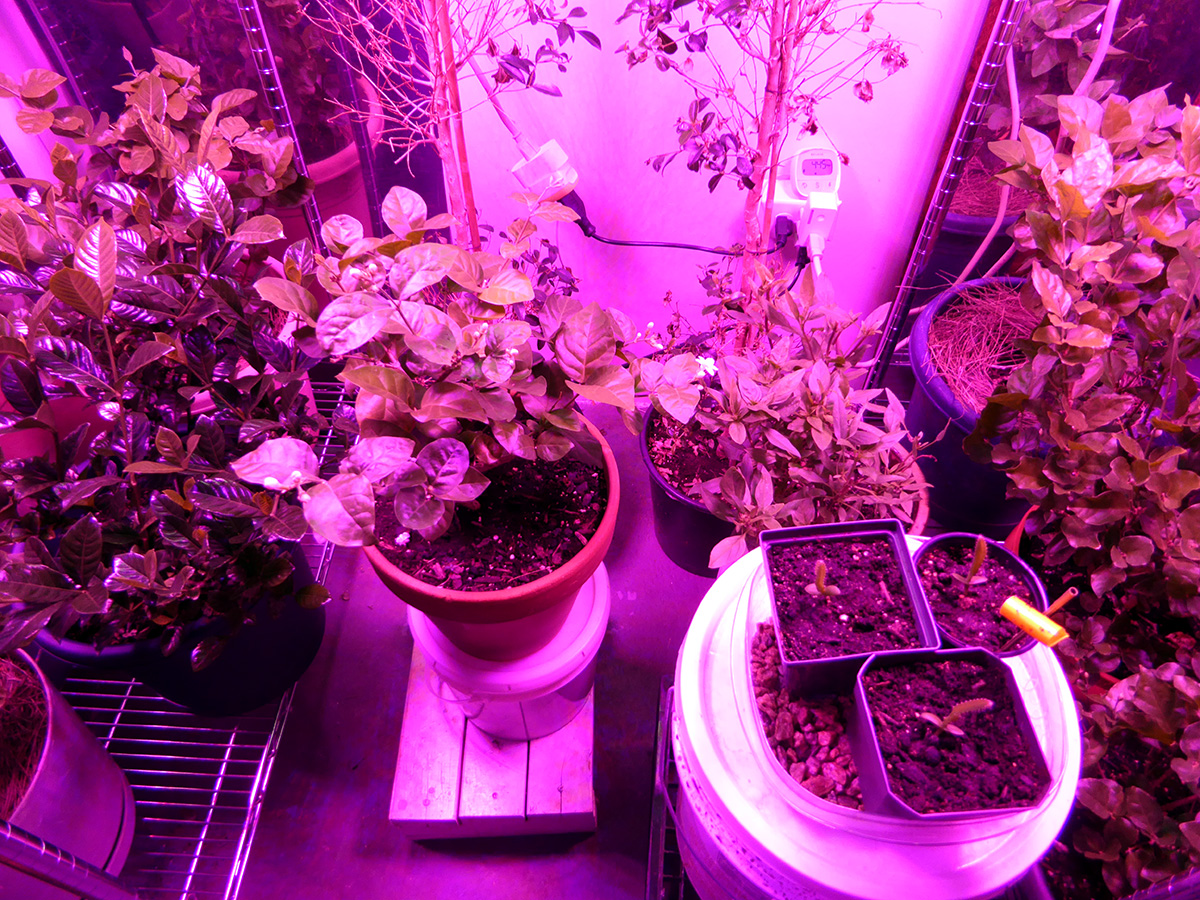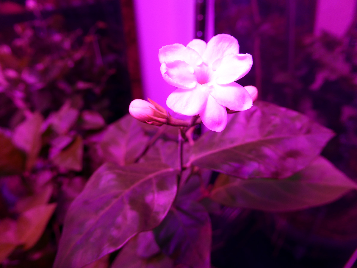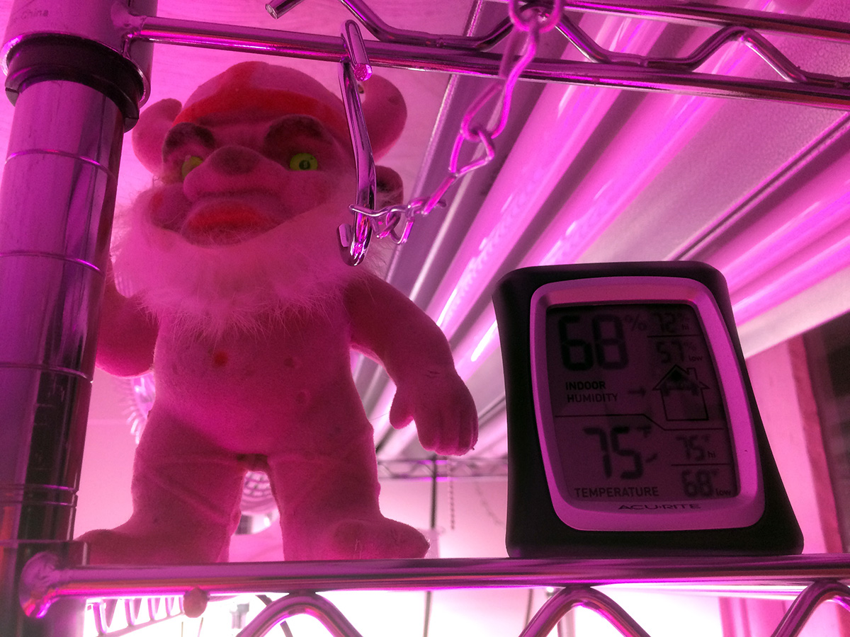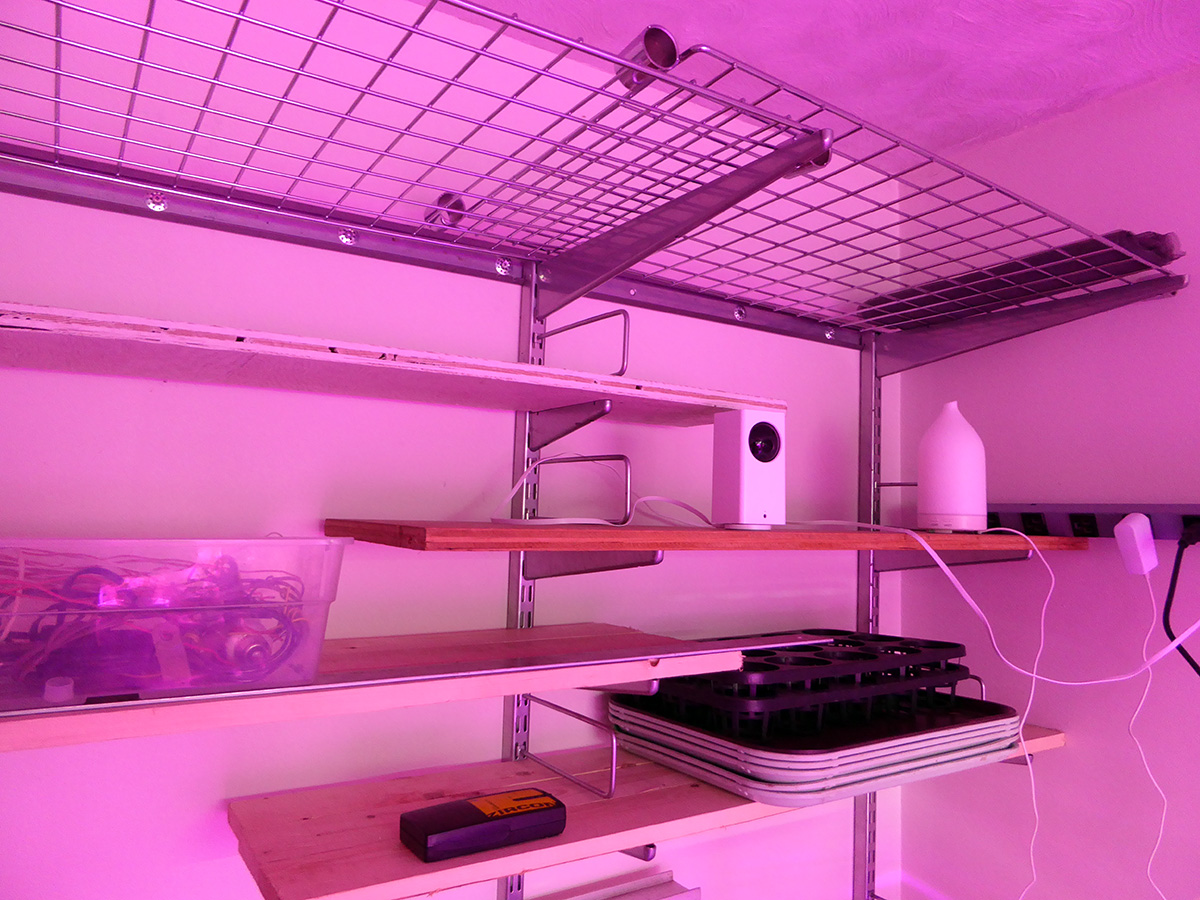 the temperature in the grow room isn't that high (68°F, just a few degrees higher than the rest of the basement) but it's the elevated humidity that makes it feel uncomfortable and hotter than it actually is. the oscillating floor fan helps a little, but the humidity still heightens a faint mildew smell. just have to run the diffuser some more to mask the odor. i noticed a second jasmine has started to show yellow leaves at the bottom; i ended up raising it a bit higher, maybe it just needs more light, because it can't be the temperature or the humidity, which is ideal for jasmines. my father had also set up a folding table so we can have something to work on.