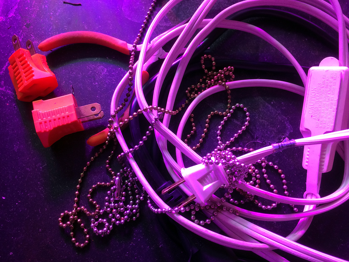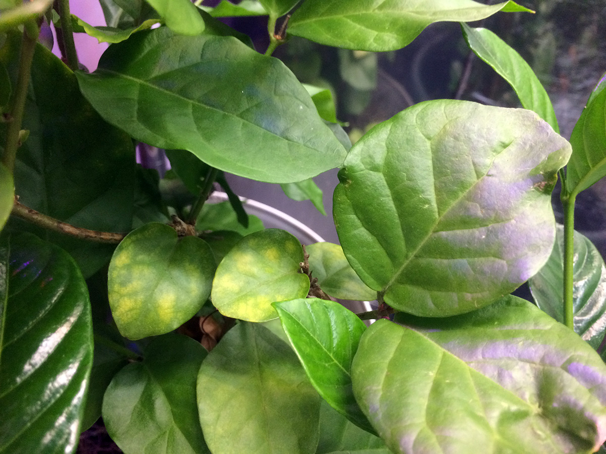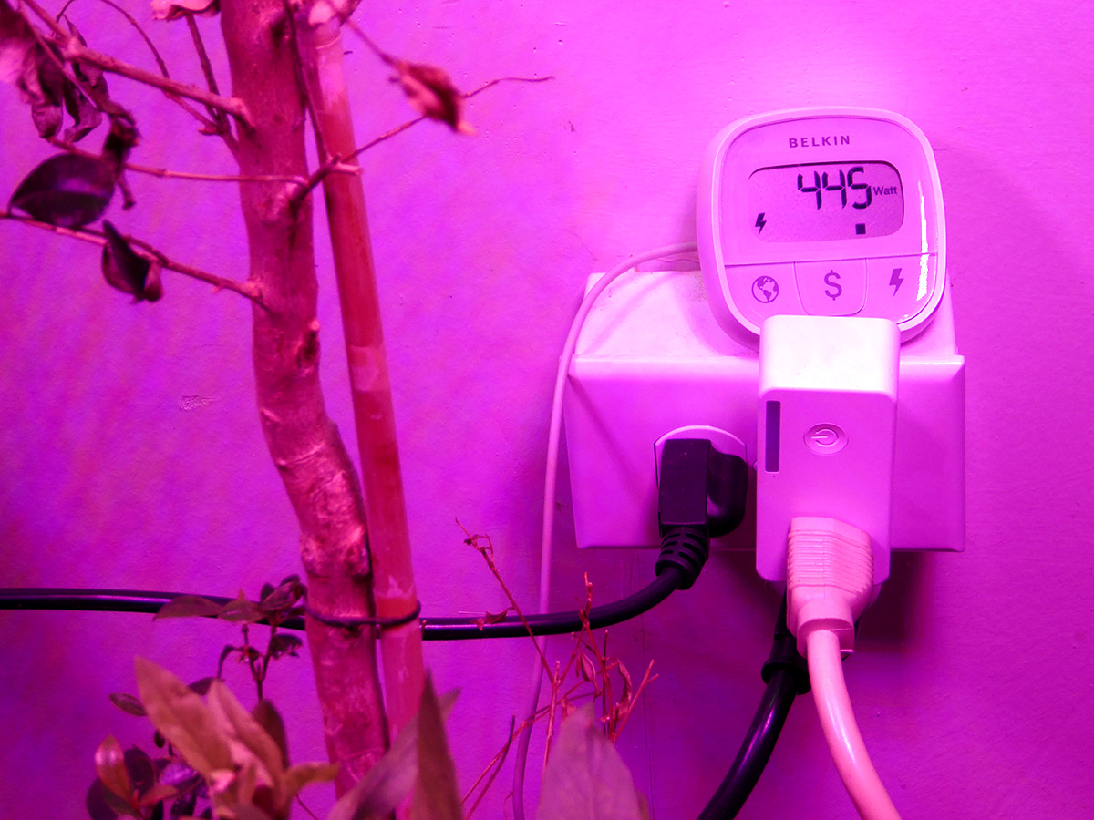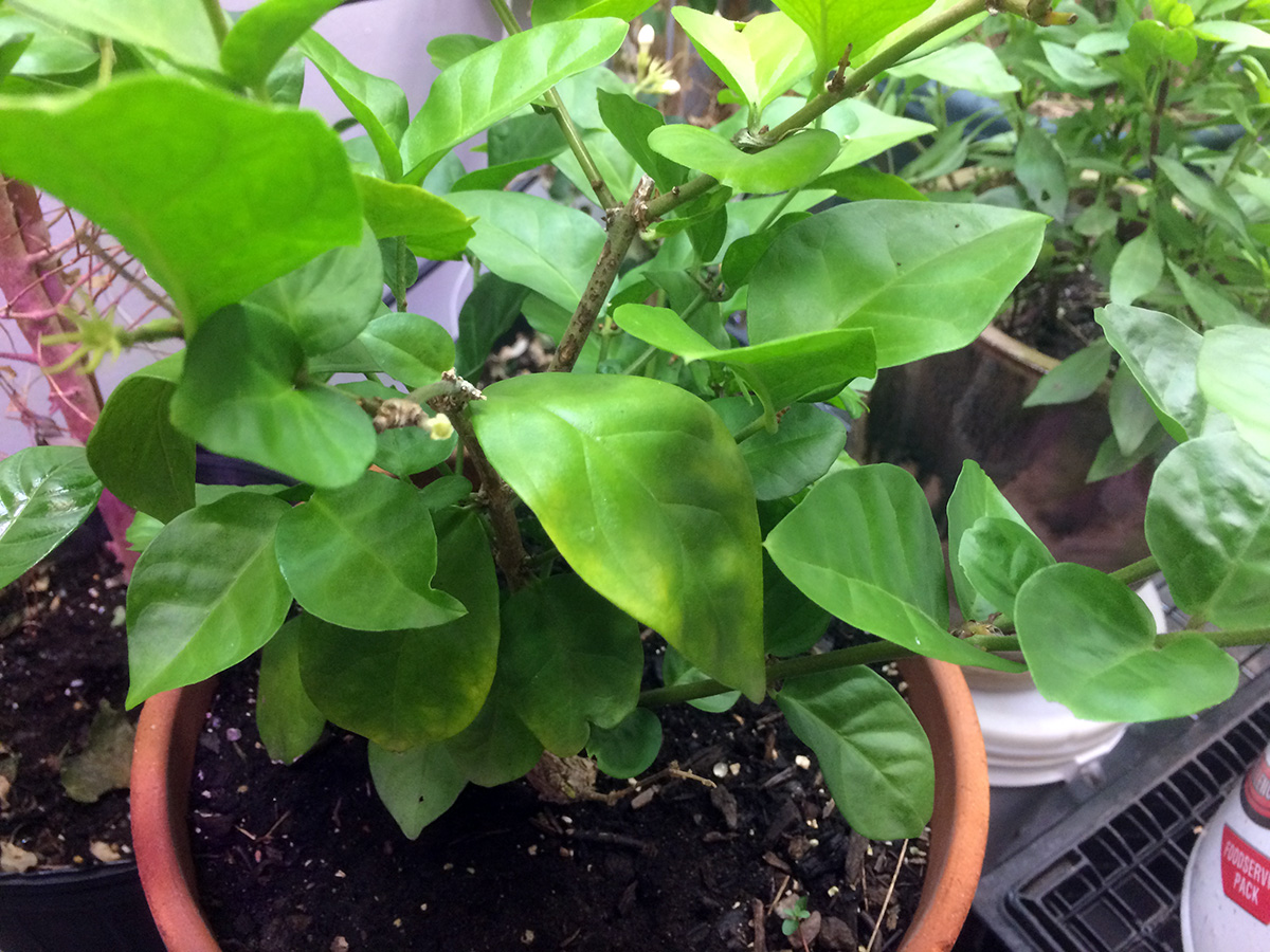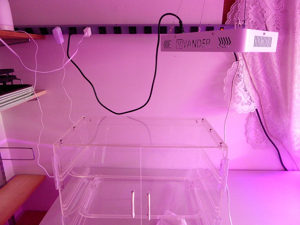 the temperature in the grow room isn't that high (68°F, just a few degrees higher than the rest of the basement) but it's the elevated humidity that makes it feel uncomfortable and hotter than it actually is. the oscillating floor fan helps a little, but the humidity still heightens a faint mildew smell. just have to run the diffuser some more to mask the odor. i noticed a second jasmine has started to show yellow leaves at the bottom; i ended up raising it a bit higher, maybe it just needs more light, because it can't be the temperature or the humidity, which is ideal for jasmines. my father had also set up a folding table so we can have something to work on.