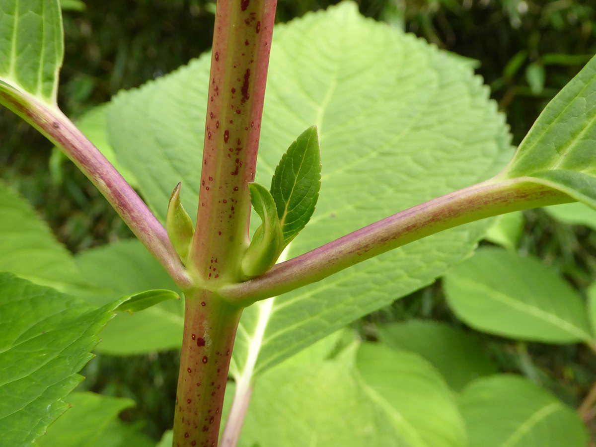 the big hydrangea bush growing in the southeastern corner of the yard is most likely a bigleaf hydrangea, based on what i've read. bigleafs form next flower buds late in the growing season. so far i haven't seen any flower buds, but some new lateral buds might be potential candidates. this year we only had a single flower because the season before the plant didn't grow many stems, and only one seemed to have survived into this season. bigleaf hydrangeas will only flower on old stems. [editor note: i discovered that hydrangeas form flower buds at the stem tips. i was looking in the wrong area. i'll check again next time.]