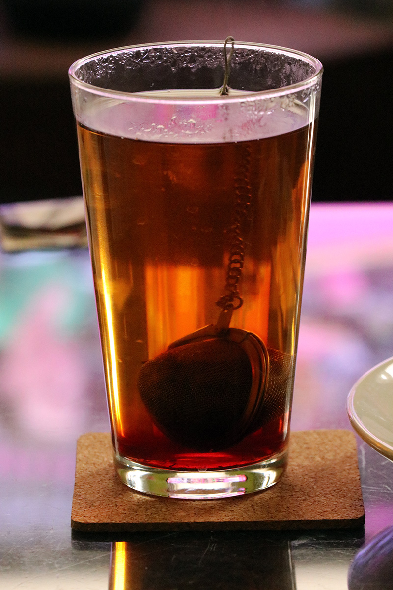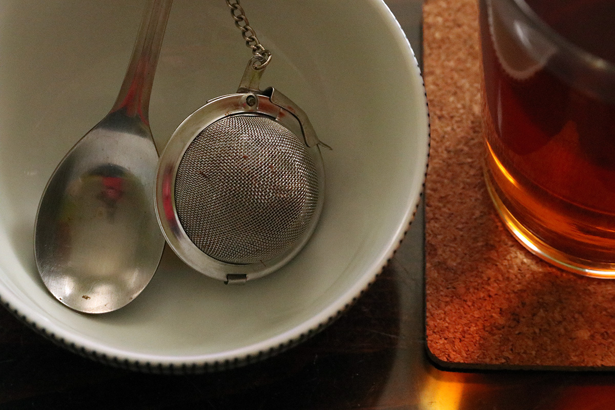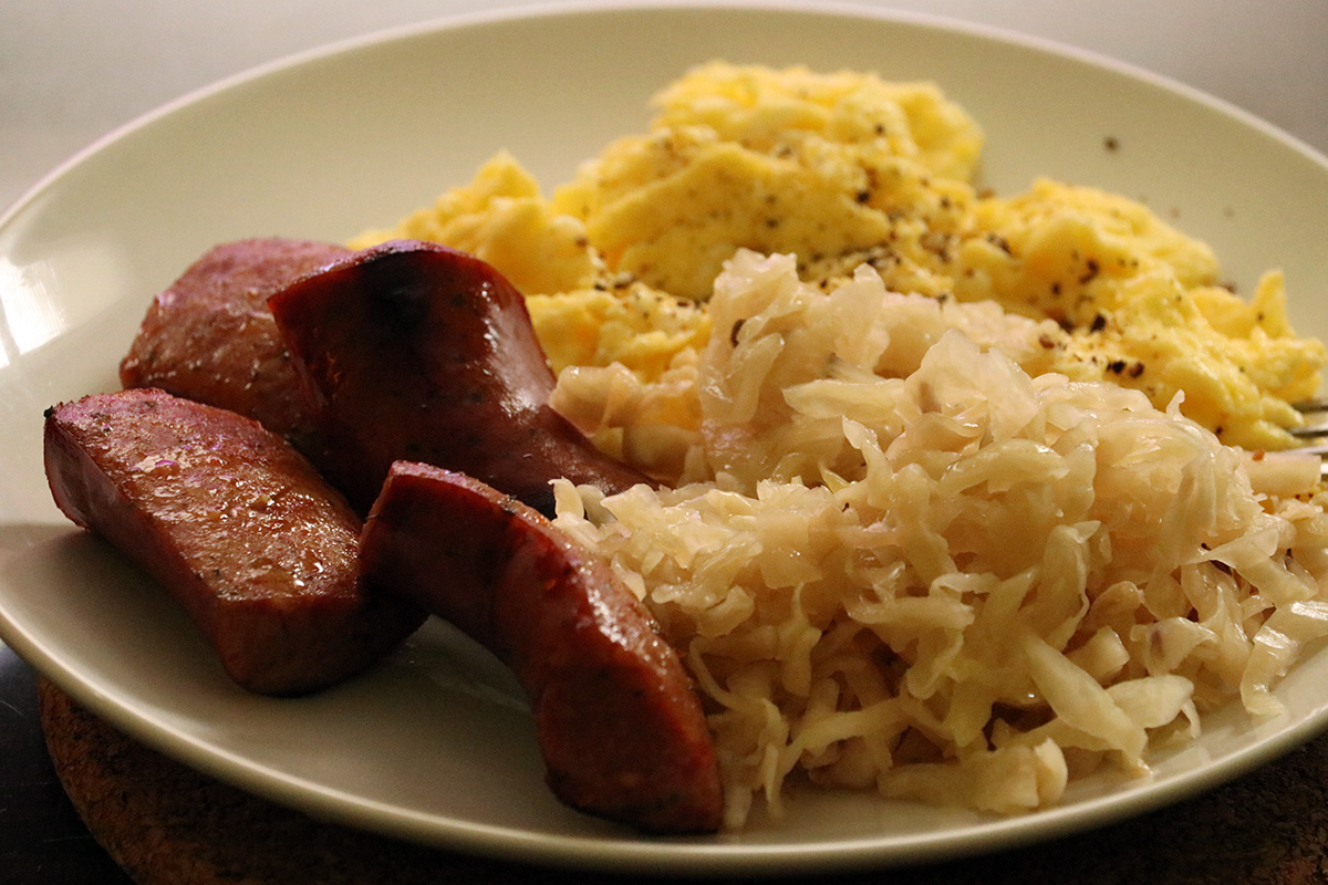 i made a scrambled eggs-korean kielbasa-homemade sauerkraut lunch along with some loose leaf rooibos tea. learning from my mistake last time, i used a mesh tea ball infuser to hold the tea so i don't drink a mouthful of leaves with every sip. it worked surprisingly well, and there rooibos was strong enough that i was able to reuse it and brew a second glass.