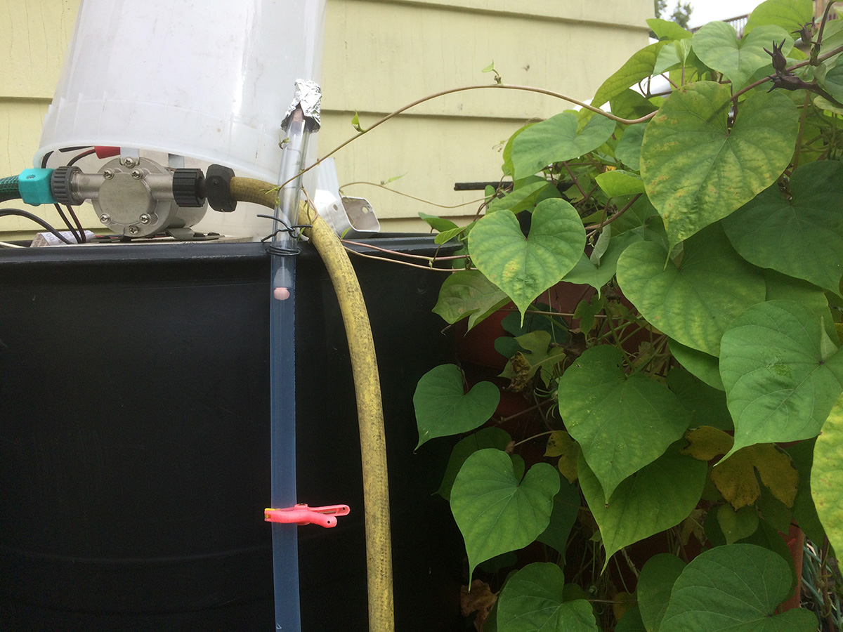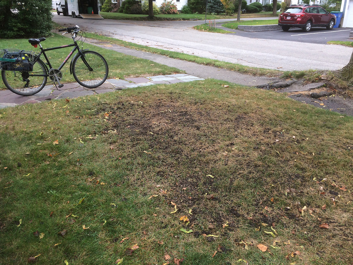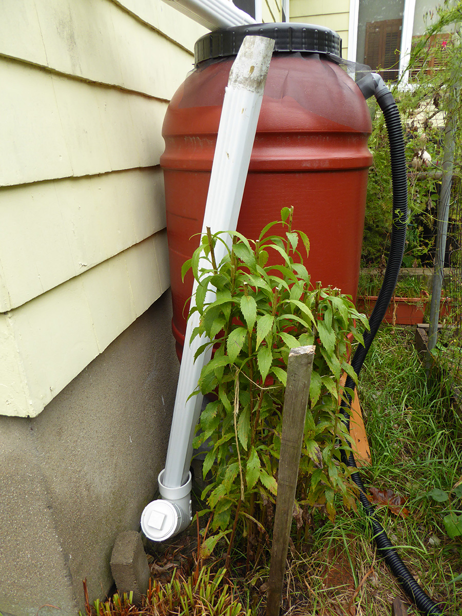 the most important thing i had to was to sow some grass seeds on the front and back lawn. with rain coming later tonight and into saturday, it's the perfect time. the center patch of front lawn needed the most help, most of it turning yellow during the late summer drought. i was hoping it'd come back but most of the grass there was already dead. i raked in a bag of top soil then hand sprinkled grass seeds into the mix. this was from a bag of generic brand (OSJL) seeds i found in the basement, not sure if they're even viable. if nothing grows after a week, i'll know my answer and need to go out and buy some fresh seeds. afterwards i watered the area with the wall faucet, before i decided to switch to our rain barrels, since they'd fill up anyway once it started raining, so better to use as much as possible. besides, it's all free anyway, rain water pumped via a battery charged from the sun. i wasn't sure if it was possible, since i had to connect two hoses together that started from the other side of the house, but it worked flawlessly.