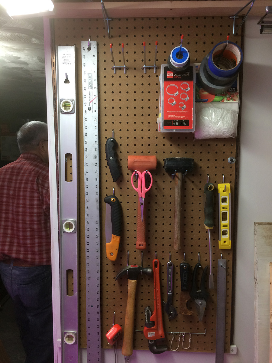 we got a chance to put up the pegboard hooks i got earlier this morning. now our basement pegboard looks very professional and organized.