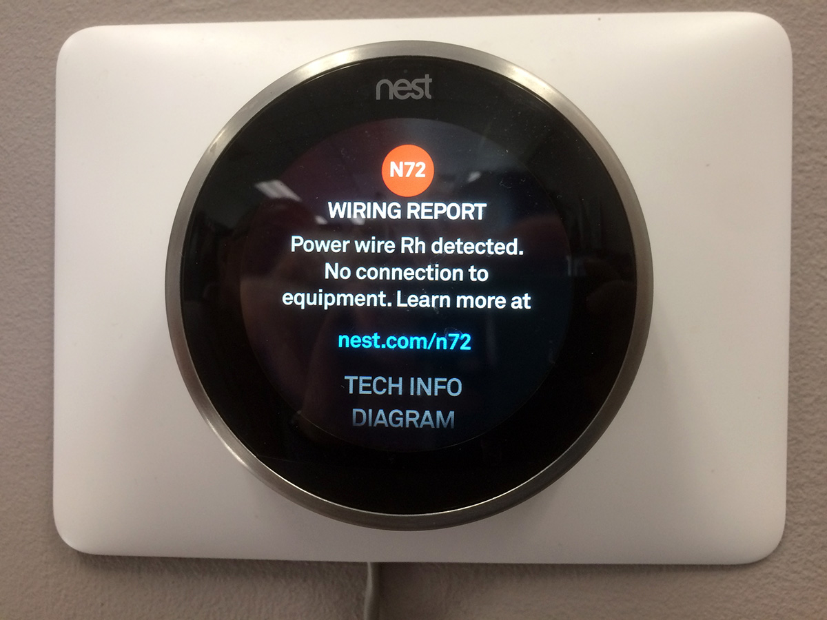 but now mid-october, with the temperature turning cooler, it was once again time for heating. we sort of kicked the can of our malfunctioning nest thermostat, but now it was time face the problem again. one thing i don't remember trying is to just use the common from the AC while connecting the heat. so the furnace would connect to W-Rh, while the common would be on Rc-C (disconnecting Y and G). i saw this wiring for an external 24VAC setup, and figured we could trying matching it, except we'd be using the AC as the common. i think in the past we tried connecting just the C wire which didn't work and the nest wouldn't even allow us to continue until we fixed the wiring. having a year to digest what we did, i now realize it didn't work (just W-C-Rh) because the C was an open loop. when we wired it again this time (Rc-C, W-Rh), there was no problem. the nest thermostat accepted the wiring, but did throw me an N72 error. from a youtube video i learned that N72 is a minor error, the nest will say this in certain conditions, like wiring in a C common wire from an external source. everything is still okay, and like the video said, the nest will still allow you to continue despite the error message. in fact, we were able to test the furnace, it turned on no problems, and we also increased the room temperature by 1 degree as an additional test, it passed as well.