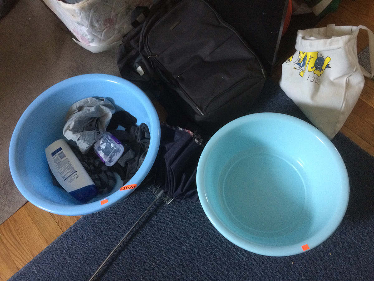 in the meantime i helped my father take down 2 window AC units from the apartment bedrooms. in the past we simply left the AC's in the windows all season because 1) they were too dirty to move, and 2) they were too heavy. but these new AC's we've installed are much lighter, and taking them down will lessen the draft coming into the bedrooms come winter. currently a male astrophysicist is living in the small bedroom and 2 other male astrophysicists are sharing the larger bedroom. i was surprised they left their doors opened, i guess none of them have much to steal. after taking down the AC's we moved them into the basement. i was admiring the plastic wash basins, which i realized last night are the perfect containers for growing lotuses next season.