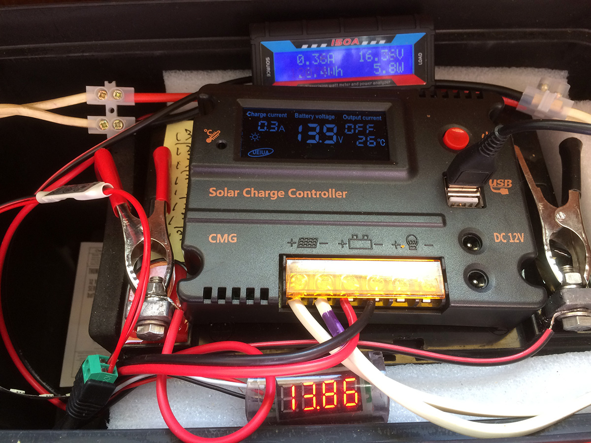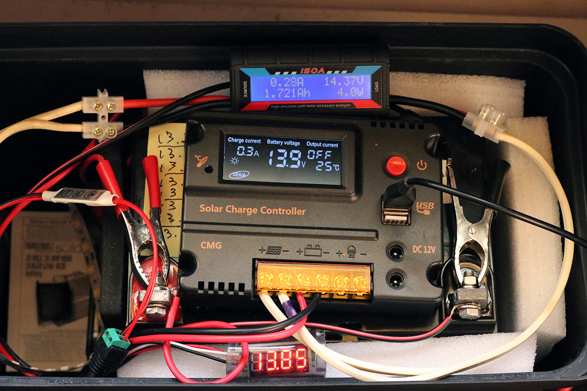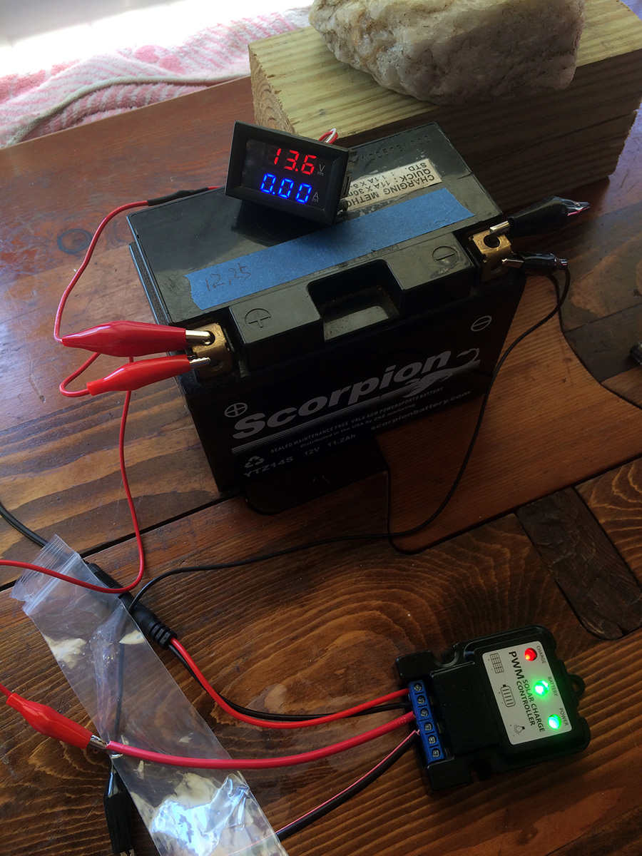 i opened up the door to the sunroom to let in all the trapped hot air circulate through the rest of the house. i also checked the status of the solar panel charging batteries. yesterday i hooked the 20W panel onto the motorcycle battery (scorpion YTZ14S 11.2Ah) because the voltage had dropped to a dangerously low 10.6V. when a battery drops that low, it's already near 0% and often times can't recover back to normal. that battery was bad to begin with, even after my father put it on a desulfating charger for weeks and months. i was worried because when i hooked up the 20W panel, the controller wasn't charging and was flashing a red led on the battery status, meaning it could sense something was wrong with the battery. but i was happy to see it was back to 13.6V today, even though that's false because once it stops charging, it will drop back down again. maybe not 10.6V, but it can't hold a charge anymore, and any amount of usage will drop the voltage to zero capacity.